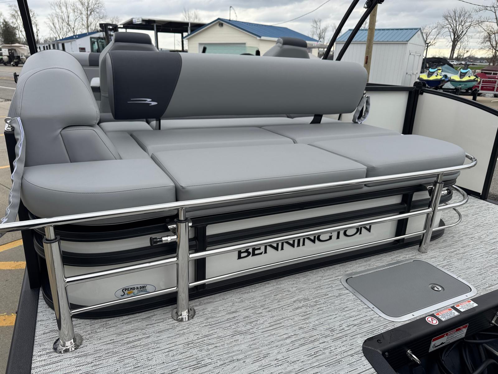 The 2026 Bennington 21 SSB SPS Pontoon stands out as a new model in the world of recreational boating. Measuring an impressive 21.92 feet in length, this pontoon offers ample space for relaxation, entertainment, and fun. Its modern silhouette, highlighted by smooth metallic white panels and blackout logos, gives it a sophisticated look that’s sure to turn heads at any marina or lake. The combination of canvas in midnight black, shadow grey accents, and the ironwood dash accent creates a striking visual appeal, making this Bennington pontoon boat for sale a true showpiece on the water.