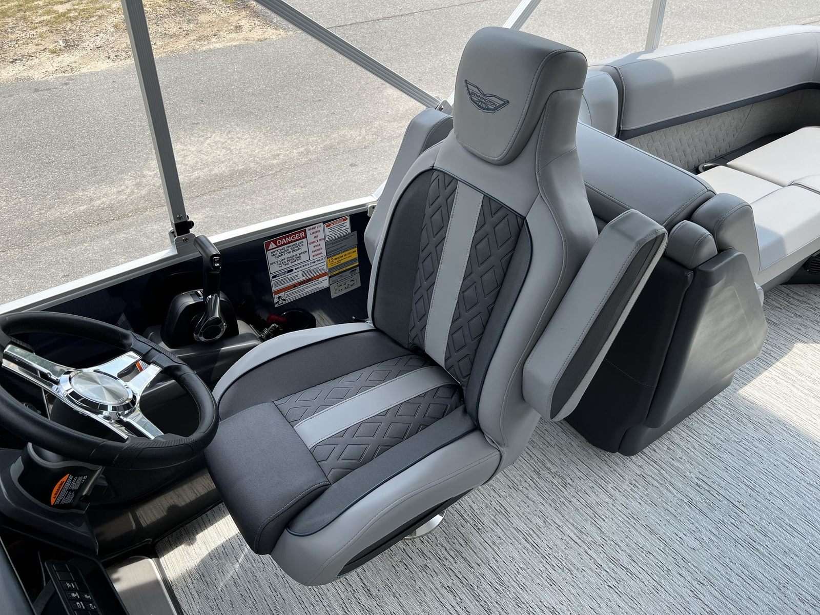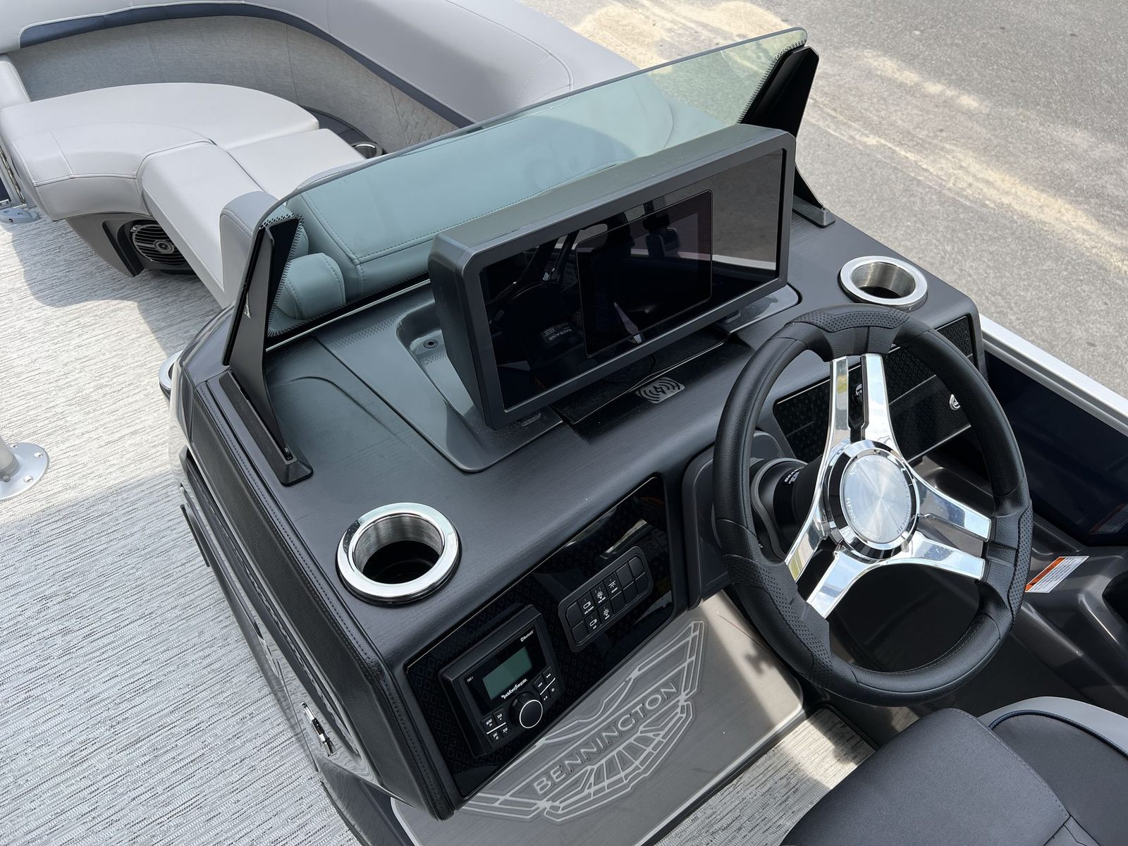 This pontoon boat is packed with premium features designed for both comfort and convenience. The non-elevated Mythos console offers intuitive access to controls and instrumentation, allowing you to navigate with confidence. The interior accent in Ocean Blue Simtex adds a touch of sophistication, while the base furniture from the M Series ensures plush seating for all passengers. The canvas in Ocean Blue Tweed not only enhances the boat’s aesthetic but also provides shade and protection from the elements.The Zebrawood Matte Slate finish adds a refined touch to the interior, complementing the smooth metallic silver accents and ocean blue panels for a cohesive, upscale look. The Benny Quick Fender Latch Kit in silver (quantity 4) makes it easy to secure fenders quickly, streamlining docking and protecting your investment. Every detail of the Bennington 22 MFB SPS pontoon boat for sale is thoughtfully designed to maximize comfort, style, and usability.