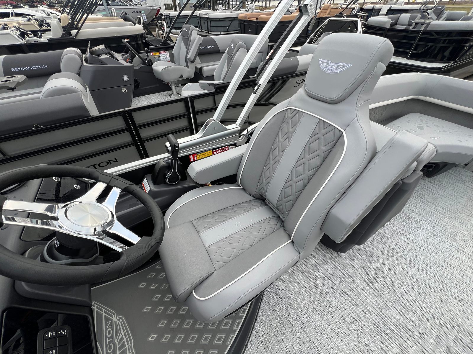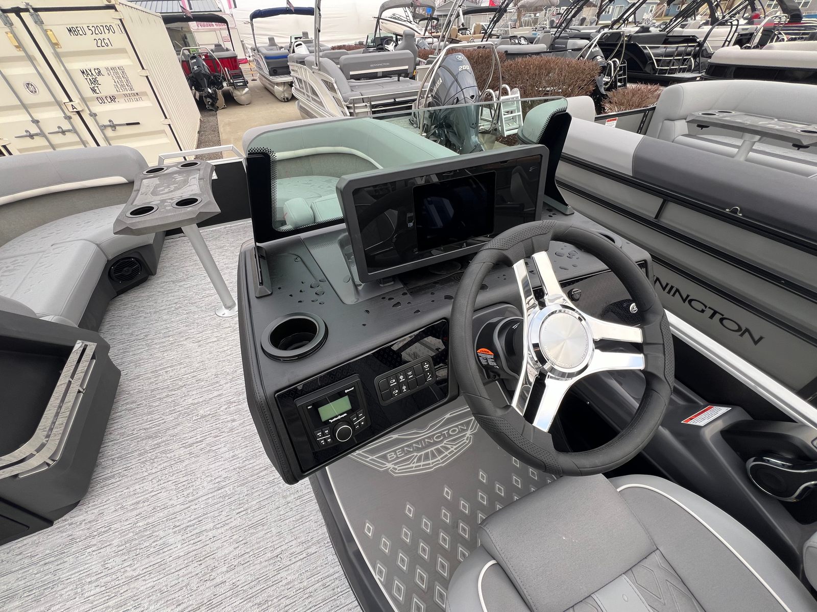Step aboard the Bennington 22 MFB SPS and you will immediately notice the attention to detail in every aspect of its design. The exterior features a sophisticated Panel in Smooth Matte Black, complemented by an Accent in Smooth Gemini Black and Shadow Grey Veneto. These modern color choices create a striking visual impression that stands out on any waterway.Inside, the Interior Accent in Arctic Ice White Simtex provides a fresh and inviting atmosphere, while the Base Furniture M Series ensures both comfort and durability for all your guests. The Elevated Console with Pocket Mythos adds a touch of luxury and convenience, placing controls and storage within easy reach for the captain. For those sunny days on the water, the Bimini Electric Power Top Curved 12B S/M Slv offers effortless shade and protection, allowing you to relax and enjoy the ride in comfort.