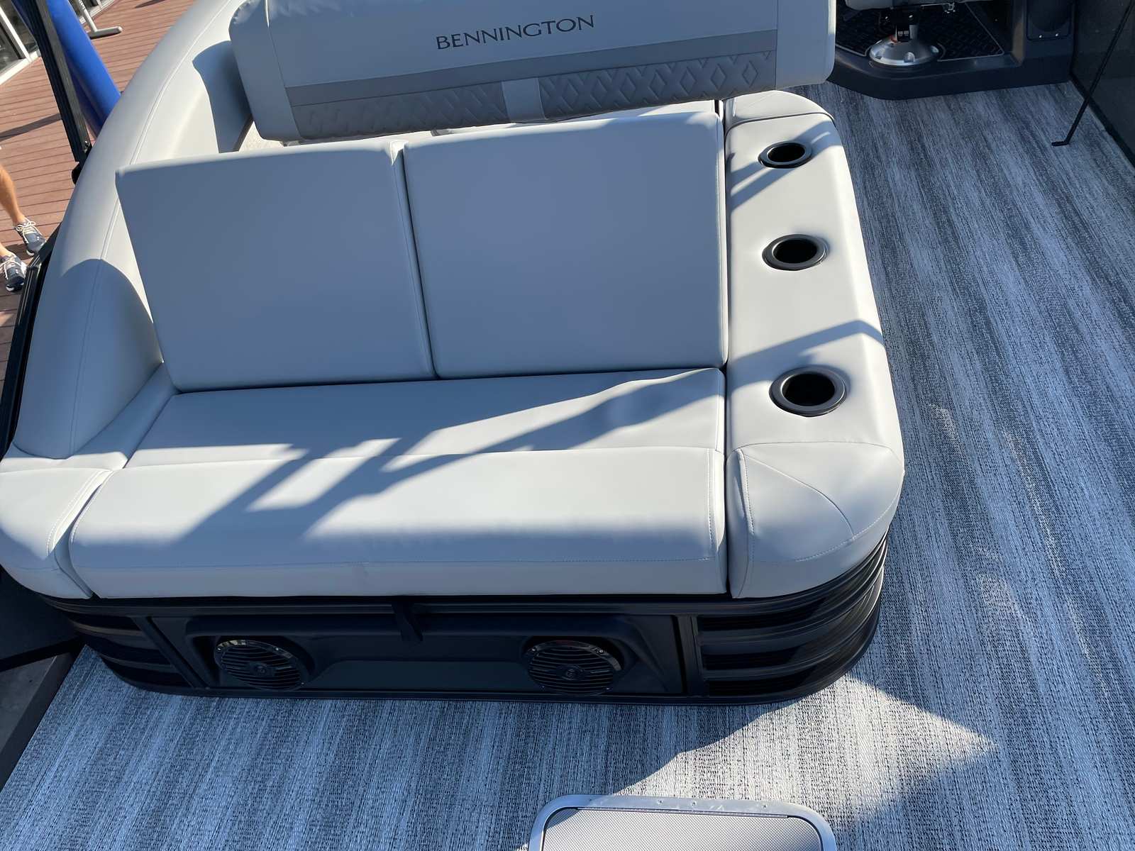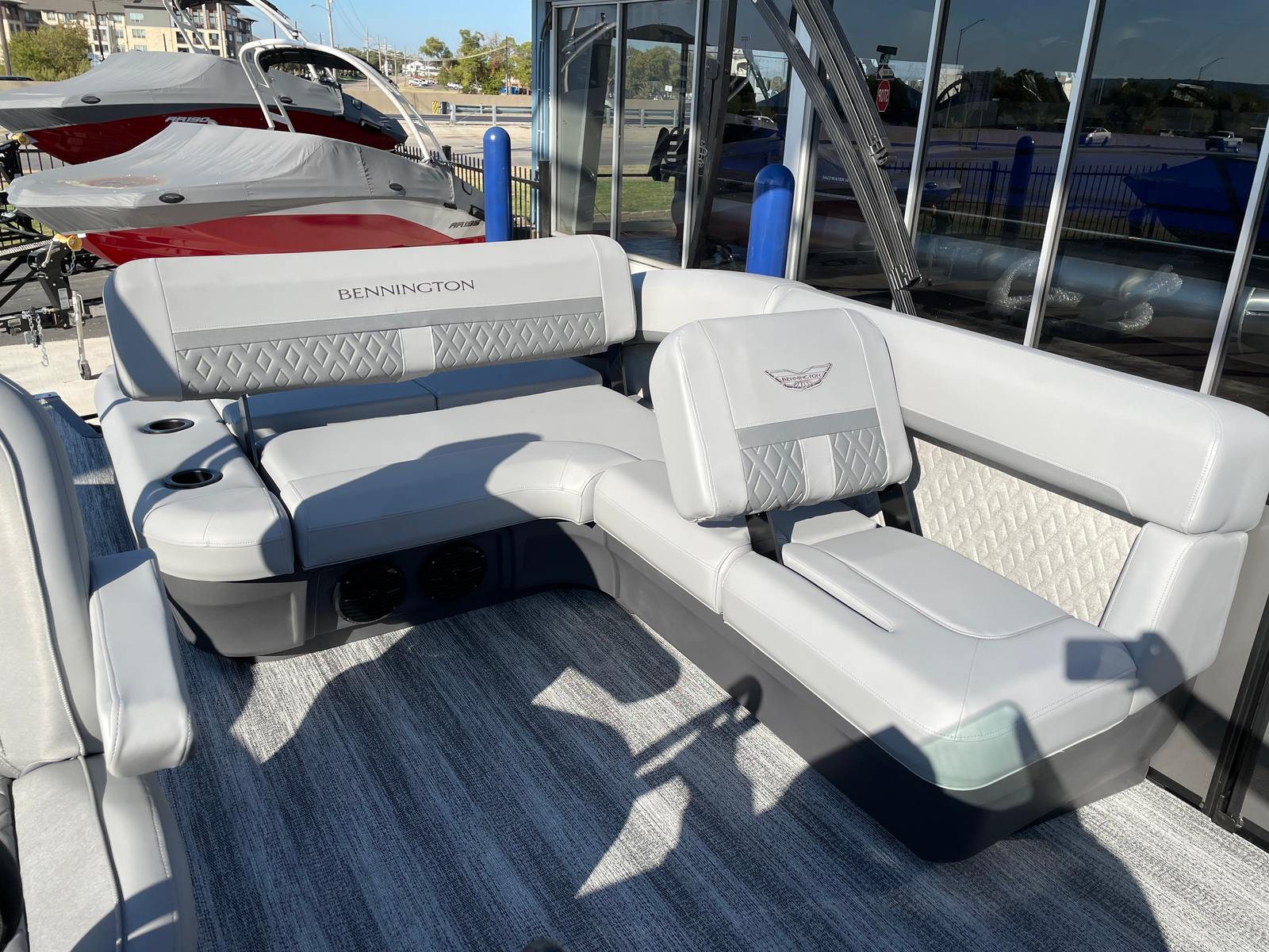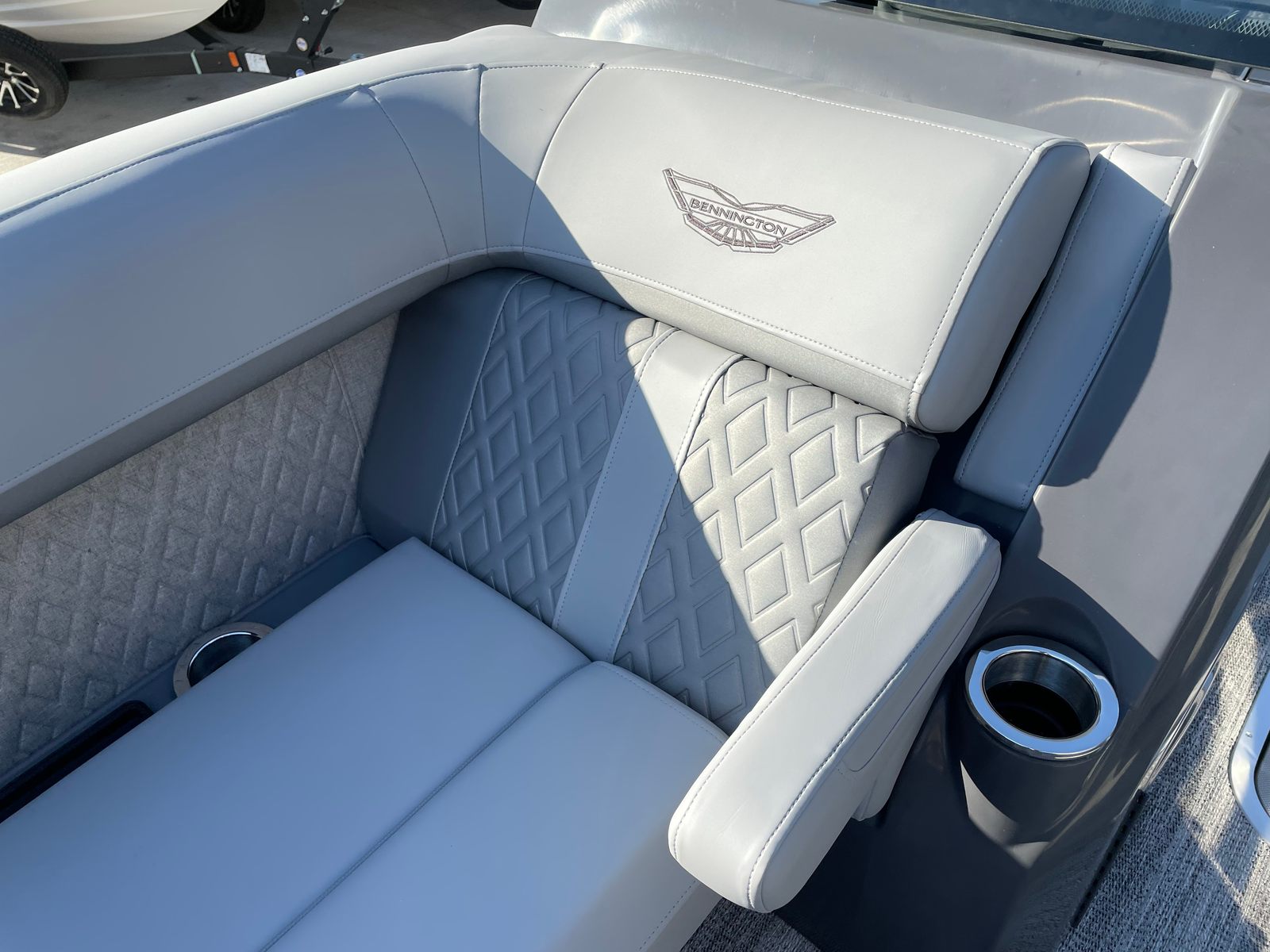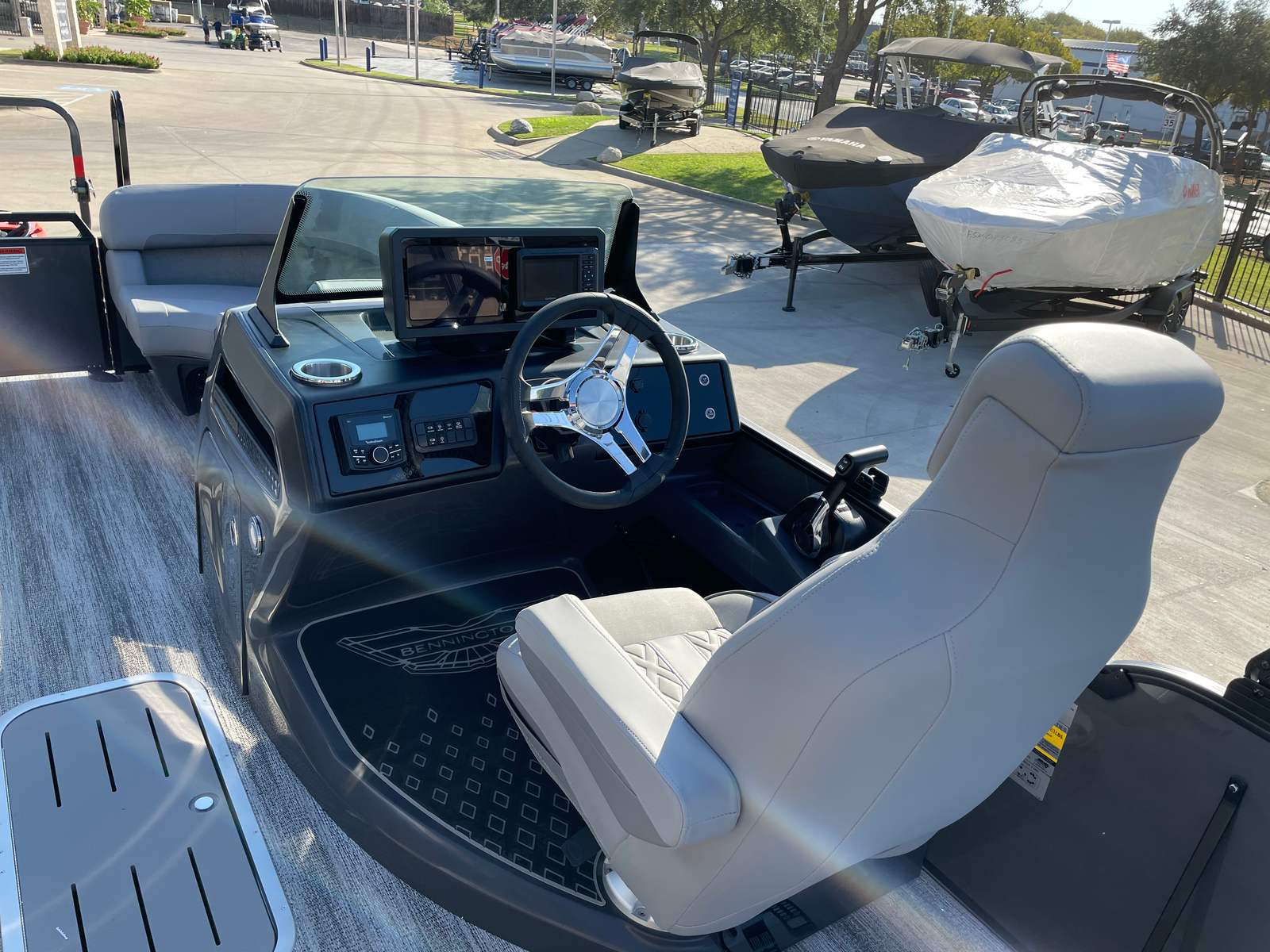 Step aboard and discover a host of premium features that set this pontoon apart. The interior accent in Graphite Simtex creates a sophisticated atmosphere, complemented by the Base Furniture M Series for ultimate comfort and style. The Zebrawood Matte Slate finish adds a touch of elegance, while the Accent - Smooth Metallic White provides a modern, eye-catching contrast. The Canvas - Midnight Black and Bimini - Curved M/LXS No Light Blk offer shade and protection from the elements, ensuring you can enjoy your time on the water in any weather.Practicality meets innovation with the Battery - Dual with Switch, giving you peace of mind and extended power for all your onboard electronics. The Ski Tow Bar opens up a world of recreational possibilities, from water skiing to tubing, making this Bennington boat for sale a versatile choice for thrill-seekers and families alike.