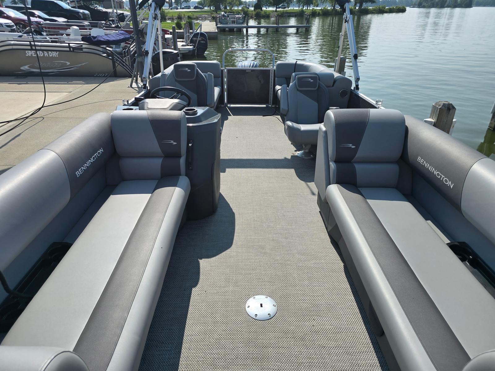 In addition to its recreational appeal, the Bennington 22 Svsr SPS is packed with practical features that make ownership a breeze. The spacious layout provides ample storage for gear, snacks, and personal items, keeping the deck clutter-free and organized. The durable Seagrass Silver flooring is not only attractive but also easy to clean, ensuring that your boat stays looking its best with minimal effort.Docking and maneuvering are made simple thanks to the responsive handling and reliable Yamaha F150XC engine. The pontoon's size strikes the perfect balance between spaciousness and ease of operation, making it suitable for both seasoned boaters and those new to the water. Fuel efficiency is another key benefit, allowing you to spend more time enjoying the lake and less time at the fuel dock.