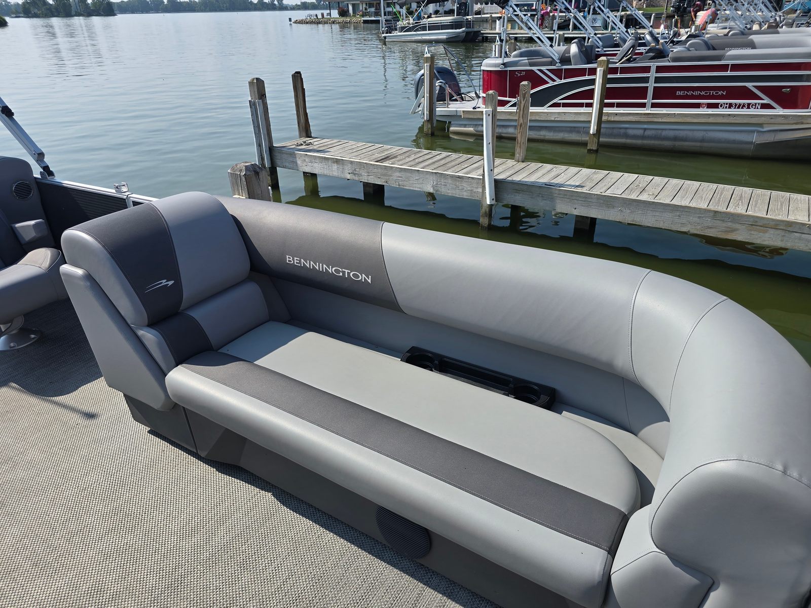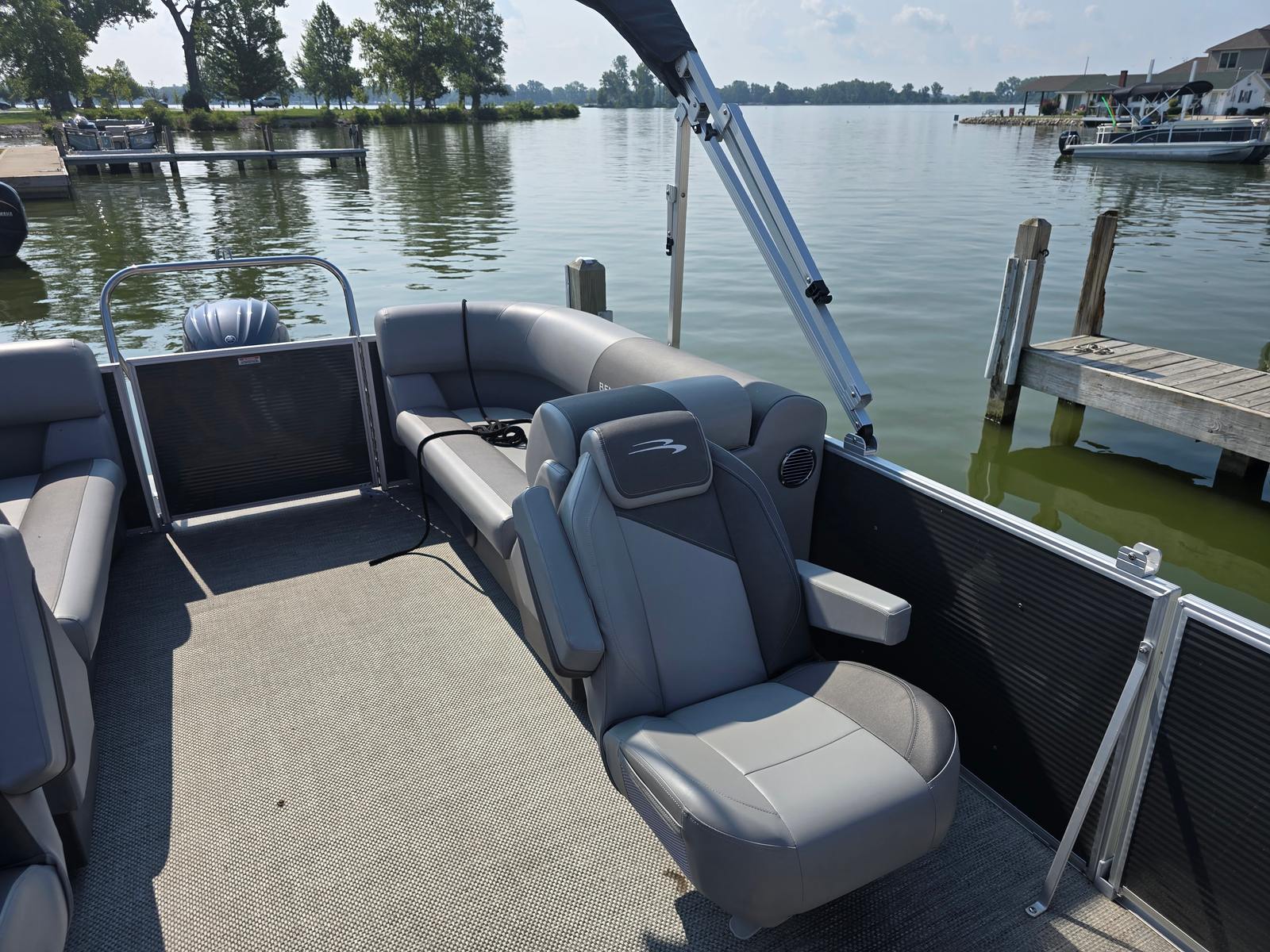 This Bennington boat for sale is loaded with features designed to enhance comfort, style, and functionality. The base furniture is upholstered in premium Simtex material, offering a soft yet durable seating surface that stands up to the elements. Both the captain's chair and co-captain's recliner are finished in Shadow Grey and Carbon, providing ergonomic support and a touch of luxury for those long days on the water. The captain's chair recliner ensures that the driver enjoys maximum comfort and control, while the co-captain's recliner invites passengers to relax and take in the scenery.The dimensional brushed logo and Anthracite paneling add a refined touch to the boat's exterior, while the Seagrass Silver full flooring provides a stylish, slip-resistant surface that is easy to clean and maintain. The thoughtful combination of base and accent colors in Shadow Grey and Carbon creates a cohesive and contemporary look throughout the vessel. Every detail, from the textured panels to the high-quality upholstery, reflects Bennington's commitment to excellence and innovation.
