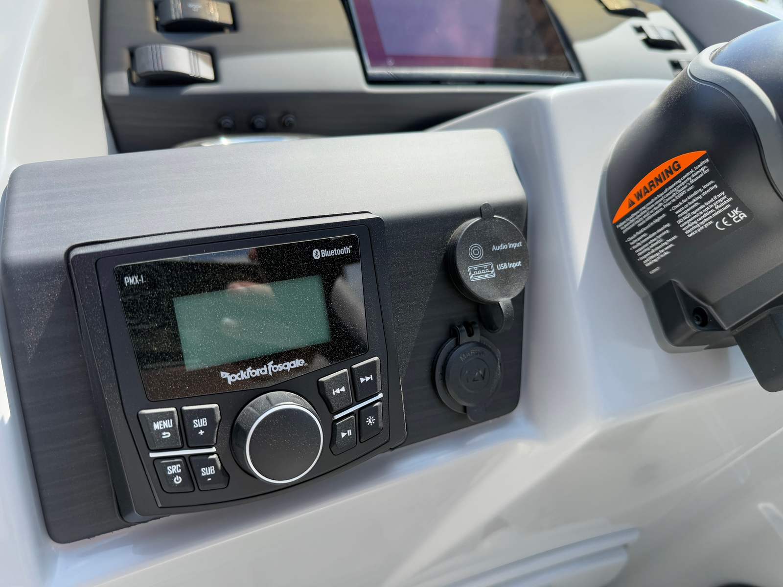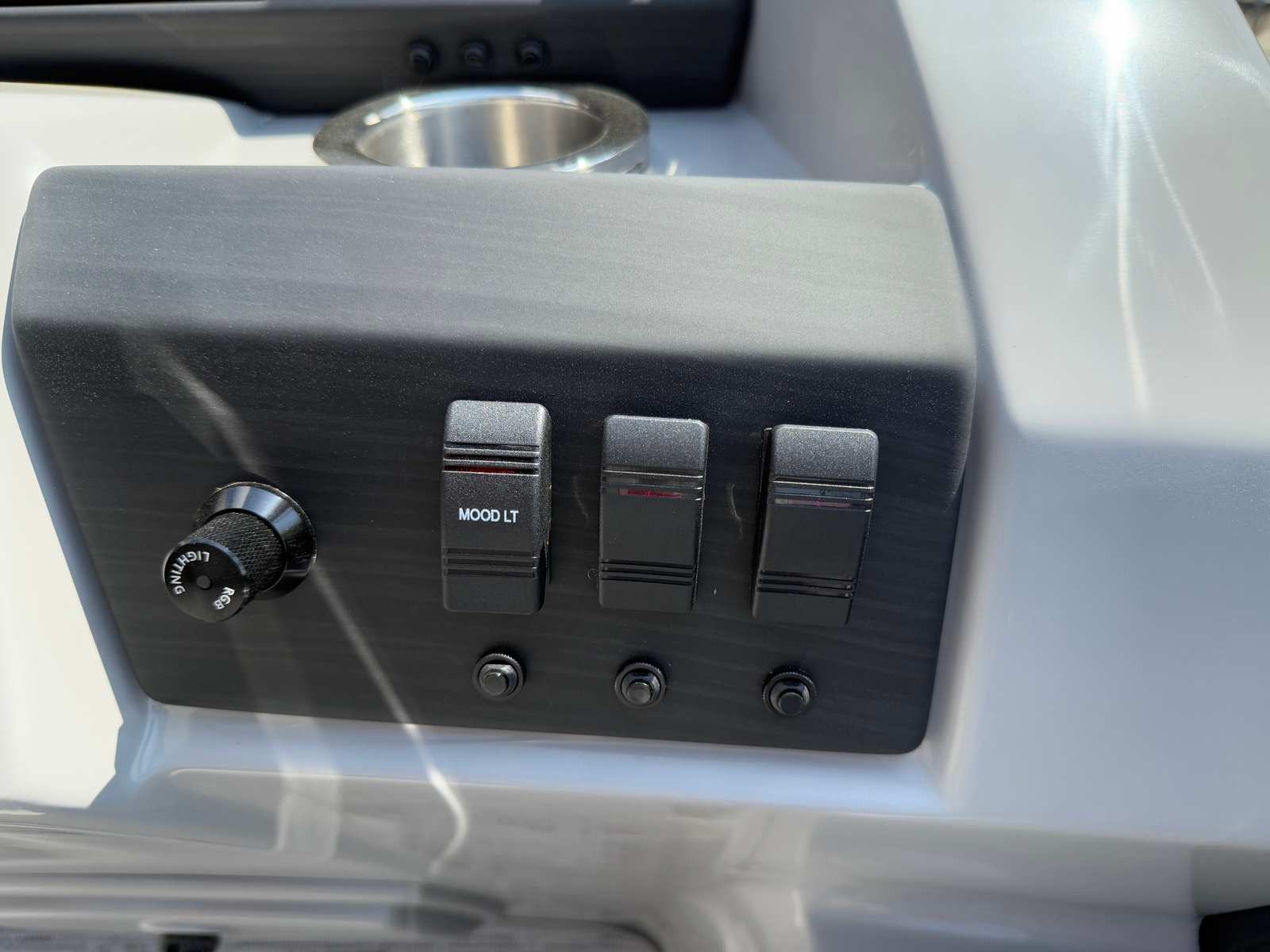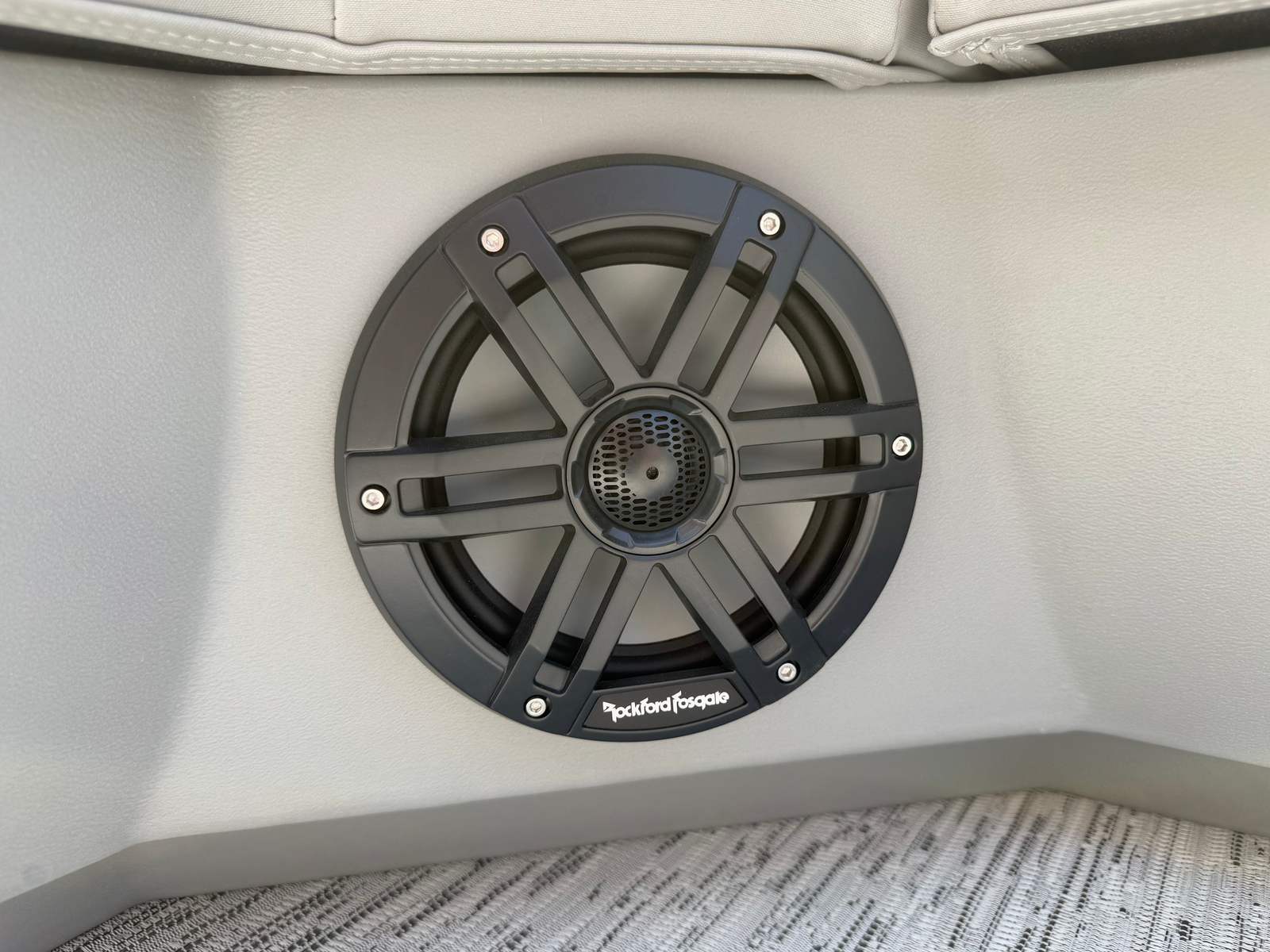 The Bennington 22 Sxsb SPS is loaded with premium features that elevate your boating experience. The portable armrest with stainless steel cup holders adds a touch of convenience and luxury, ensuring that your favorite beverages are always within reach. Rub rail protectors safeguard your pontoon’s exterior, maintaining its pristine appearance even after frequent docking. The RGB toe kick lighting and RGB controller SX allow you to customize the ambiance on board, creating a vibrant and inviting atmosphere for evening cruises or celebrations.For music lovers, the Rockford Fosgate M1 lighted speakers deliver crystal-clear sound and dynamic lighting effects, transforming your pontoon into a floating entertainment hub. The zebrawood matte slate accents and canvas in midnight black provide a sophisticated and modern aesthetic, while the blackout logos add a bold finishing touch. Every detail of the Bennington 22 Sxsb SPS is thoughtfully designed to enhance both style and functionality, making it a top choice among pontoon boats for sale.