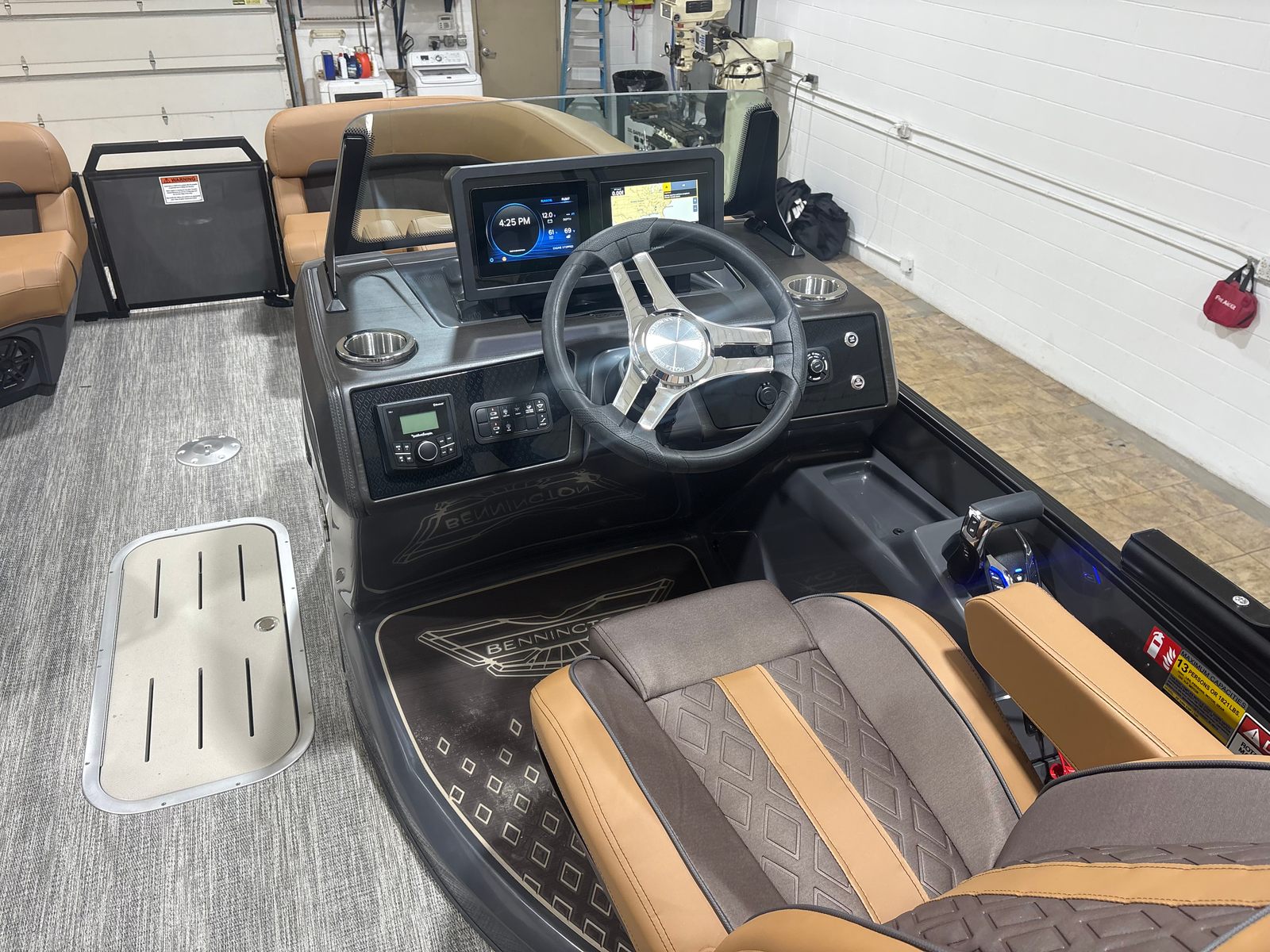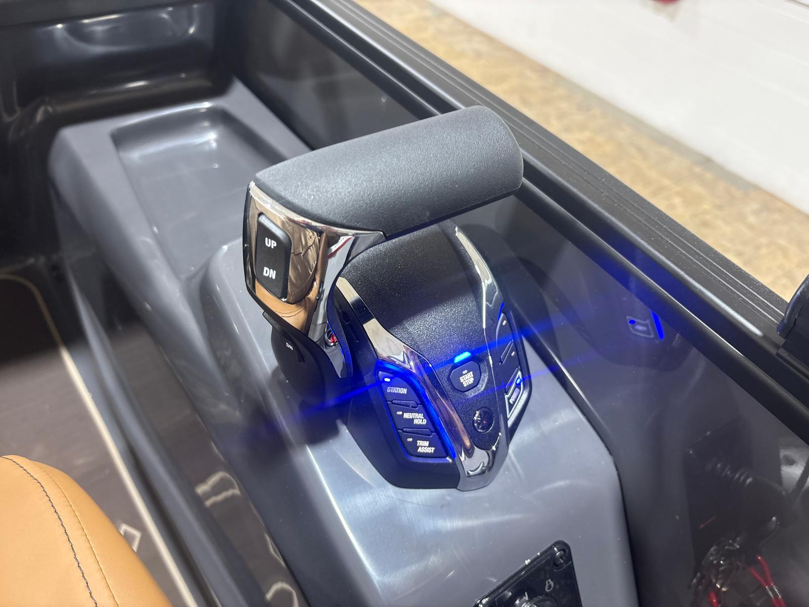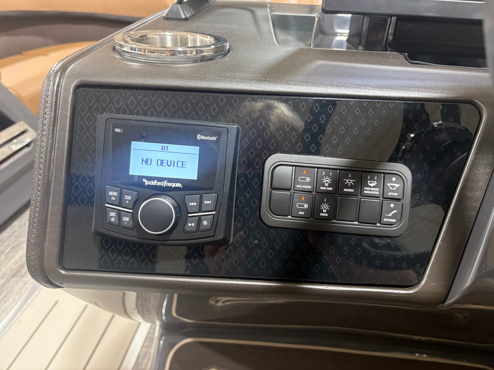 The Bennington 23 MFB ESP is packed with premium features designed to enhance your time on the water. The RGB Control M Series allows you to customize the ambiance with vibrant lighting, while exterior side lighting and underwater lighting create a captivating visual effect during evening cruises. Five illuminated cupholders ensure your favorite beverages are always within reach, and the toekick lights (three 41-inch and one 72-inch) add a touch of elegance and safety to the deck area.Enjoy shade and comfort with the Bimini Electric Power Top Curved 12B S/M Black, which provides effortless protection from the sun at the touch of a button. The Rockford Fosgate M1 lighted speakers (six in total) deliver crystal-clear audio and immersive sound, perfect for setting the mood or hosting a lively party. The elevated console Mythos offers advanced controls and a commanding view, making navigation intuitive and enjoyable.