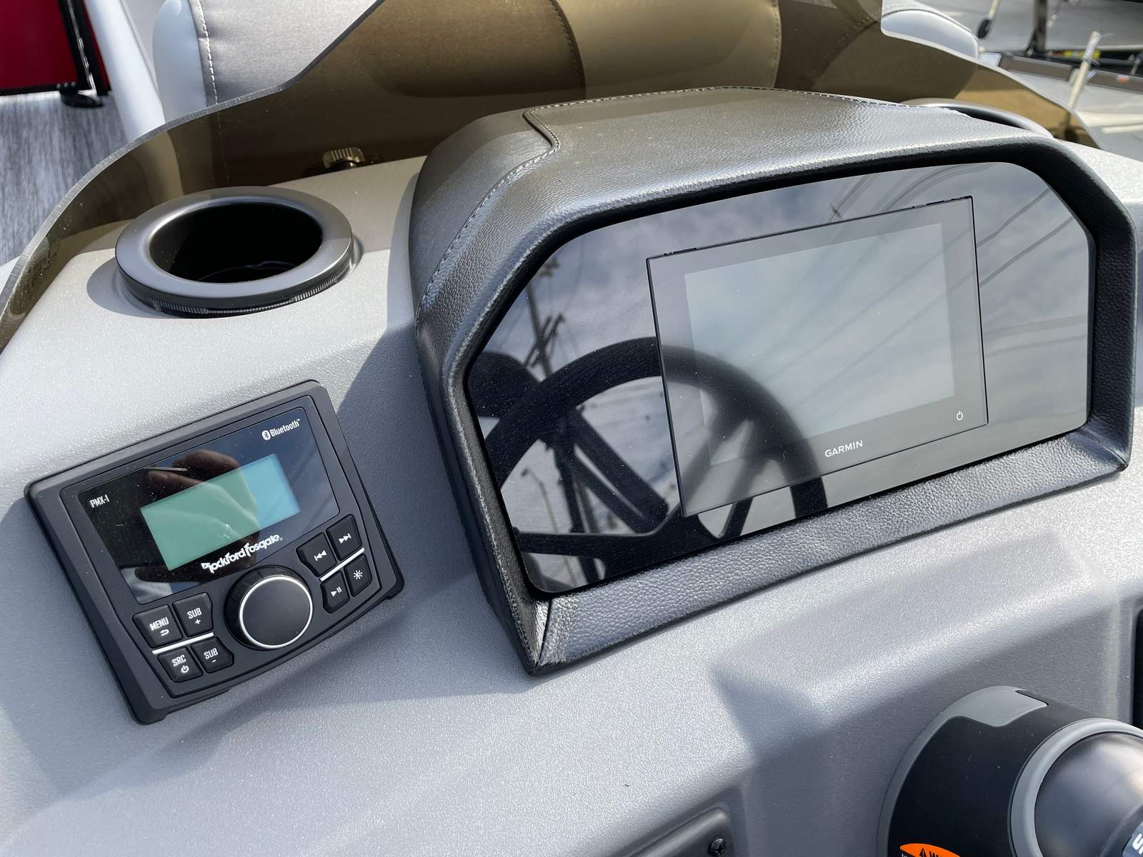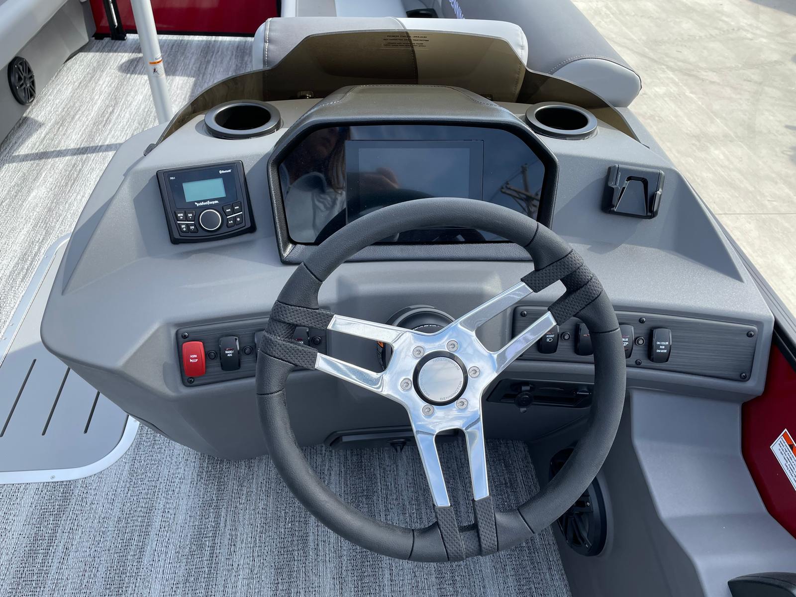 Step aboard the Bennington 23 SSB SPS Plus and discover a host of premium features designed to maximize comfort, convenience, and entertainment. The dual battery switch with fuse ensures reliable power management, giving you peace of mind during extended outings. Lighted cupholders add a touch of elegance and practicality, making evening cruises both stylish and functional.Music lovers will appreciate the Rockford Fosgate 6.5" M1 Lighted Speakers, complete with an RGB control upgrade, allowing you to set the perfect mood with customizable lighting and high-quality sound. The Serene Soft Touch Vinyl with Simtex Accents provides plush, durable seating that invites you to relax in luxury, while the Blackout Logos add a modern, sophisticated edge to the boat’s appearance.