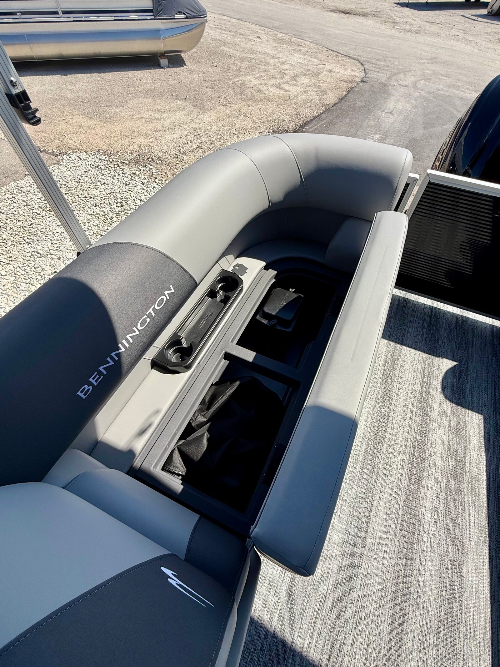 This pontoon boat is packed with special features designed to maximize comfort, convenience, and enjoyment. The Sunshine Package creates a bright and inviting atmosphere, perfect for sunny days spent on the water. The Serene Soft Touch Vinyl with Simtex Accents elevates the seating experience, providing plush support and a refined look throughout the boat. The double bimini standard (16.5') offers generous shade, allowing you to relax and socialize in comfort even during the hottest afternoons. The Ironwood Dash Accent adds a luxurious touch to the helm, while the canvas in Midnight Black and the Shadow Grey and Shoreline Grey color scheme deliver a modern, sophisticated aesthetic. The SPS+ Performance Package includes a 33-gallon transom direct fill, ensuring you have plenty of fuel capacity for longer excursions. Every detail of the Bennington 23 SSR SPS Plus is thoughtfully designed to enhance your time on the water.
