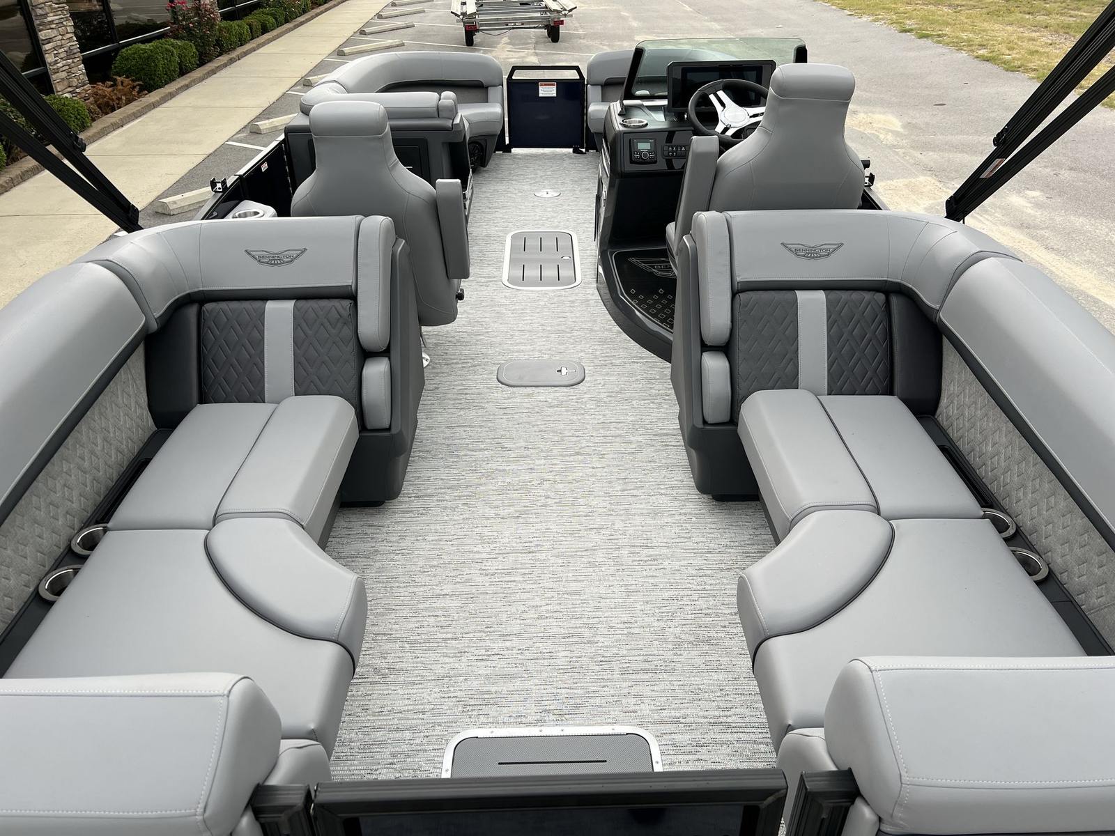 The 2026 Bennington 24 MFB ESP is a new pontoon boat that measures an impressive 23.33 feet in length, offering ample space for family, friends, and all your favorite water activities. Bennington is renowned for its commitment to quality, and this model is no exception. The elegant Midnight Blue Smooth panel color, accented by Metallic Silver Smooth, creates a striking visual presence on the water, while the Veneto Graphite vinyl base and Blackout Luxe Package add a touch of sophistication and modern flair. Whether you are cruising a quiet lake or entertaining guests at the dock, this Bennington boat for sale is designed to turn heads and deliver unforgettable experiences.