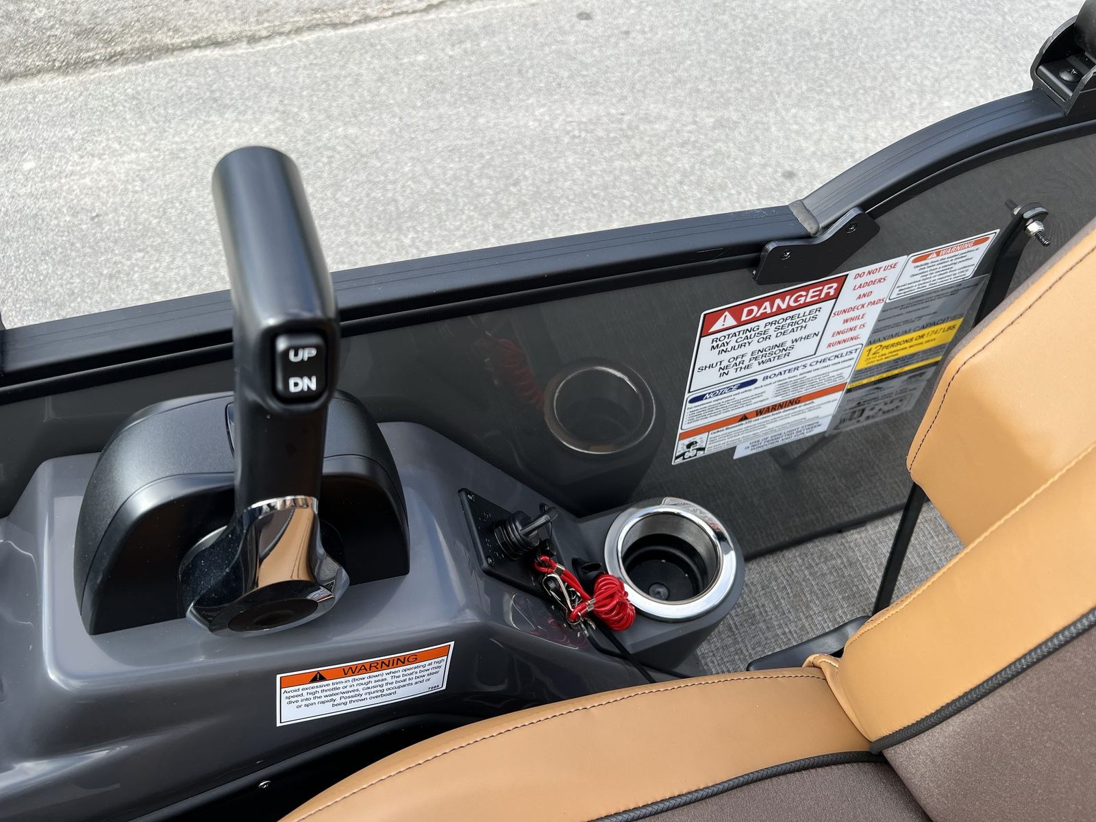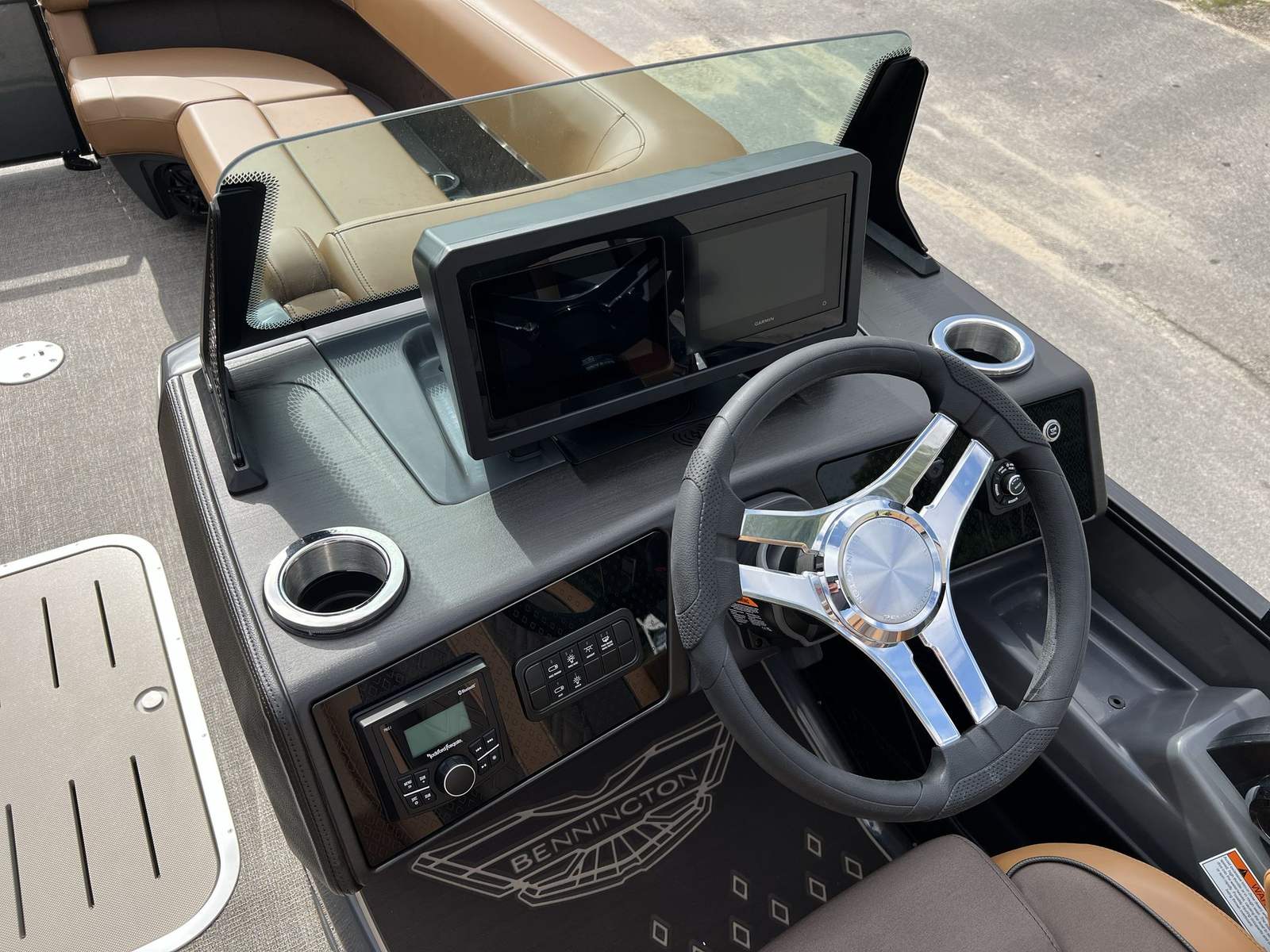 This pontoon boat is packed with special features designed to enhance your time on the water. The single switch battery system offers convenience and peace of mind, ensuring your boat is always ready to go. The RGB Control M Series allows you to customize the lighting ambiance, creating the perfect mood for any occasion. Exterior side lighting and toekick lights (2-62") not only add a touch of elegance but also improve visibility and safety during evening outings.For music lovers, the Rockford Fosgate M1 lighted speakers deliver premium sound quality, turning every cruise into a floating party. The elevated console with pocket Mythos provides an ergonomic and stylish command center, while the base furniture M Series ensures maximum comfort for all passengers. The interior is finished with Zebrawood Matte Beige accents, adding a sophisticated and contemporary touch to the overall design.