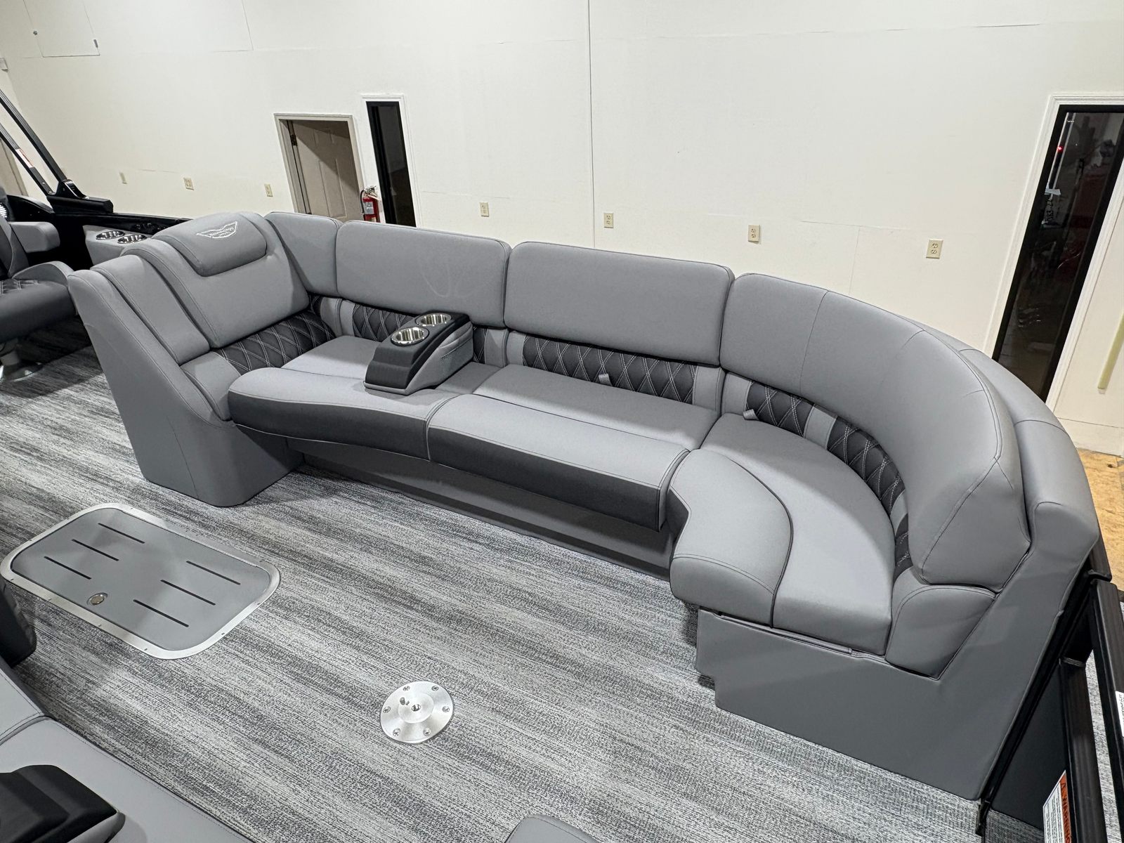 Step aboard and discover a world of luxury and innovation. The Bennington 25 RFB ESP is equipped with a suite of special features designed to elevate your on-water experience. Eight illuminated cupholders ensure your favorite beverages are always within reach, even during evening cruises. Exterior side lighting and underwater lighting create a captivating ambiance, transforming your pontoon into a floating oasis after sunset. Toekick lights, including two 37-inch and two 62-inch strips, add a touch of elegance and safety, illuminating pathways for guests.The electric power top Bimini, finished in a sleek curved R black design, provides effortless shade and protection from the elements at the touch of a button. The audio system is a true standout, featuring Rockford Fosgate 6.5-inch M2 speakers, two 8-inch M2 speakers in the fastback, a powerful 10-inch M2 subwoofer, and a dual 901826 PM Punch amplifier upgrade. This premium sound setup ensures your favorite playlists sound crisp and immersive, whether you’re anchored at your favorite cove or cruising along the shoreline.