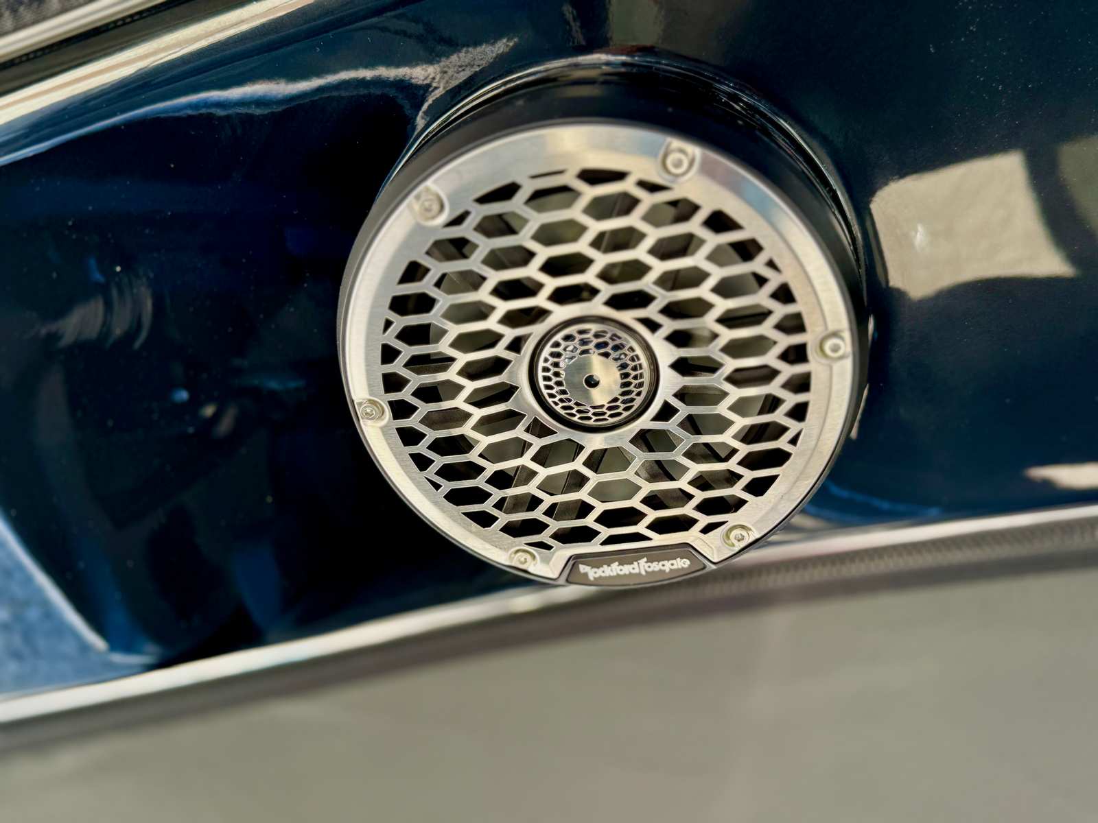 The Bennington 27 QXFBWAX2 ESP is loaded with special features that set it apart from other pontoon boats for sale. The Sunshine Package ensures that every outing is bright and cheerful, while RGB Toe Kick Lighting (R/RX/Q) adds a vibrant, customizable ambiance to the deck. Nine illuminated cupholders keep your favorite beverages within reach and glowing after sunset, enhancing both convenience and style. Exterior side lighting and underwater lighting create a striking visual effect, making your boat stand out during evening cruises or dockside gatherings.Blackout logos give the boat a modern, sophisticated look, while the Rockford Fosgate audio system transforms your pontoon into a floating entertainment hub. Enjoy six 6.5" M2 speakers, two 8" M2 speakers (Fastback), a powerful 10" M2 subwoofer, and a dual PM Punch amplifier upgrade for crystal-clear sound and deep bass. The interior features Graphite Simtex upholstery and accent details in perforated metallic carbon, offering both comfort and contemporary flair.