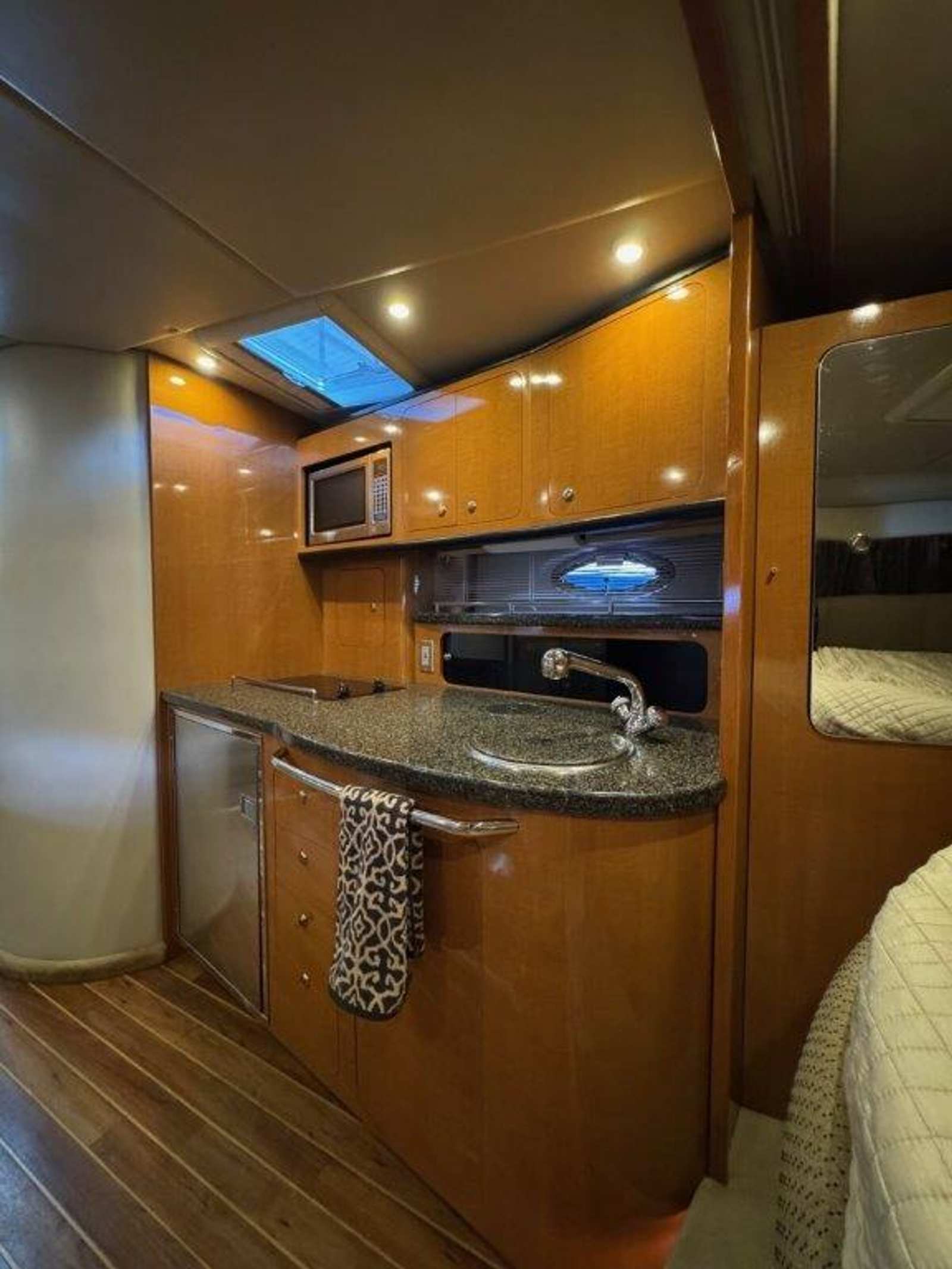 Inside, the cabin features teak and holly vinyl flooring, an aft cabin that easily converts from a lounge to a private berth, and a comfortable salon with a large settee. The galley is well-equipped with stainless appliances and plenty of storage, while the forward stateroom provides a private centerline berth with a solid door.