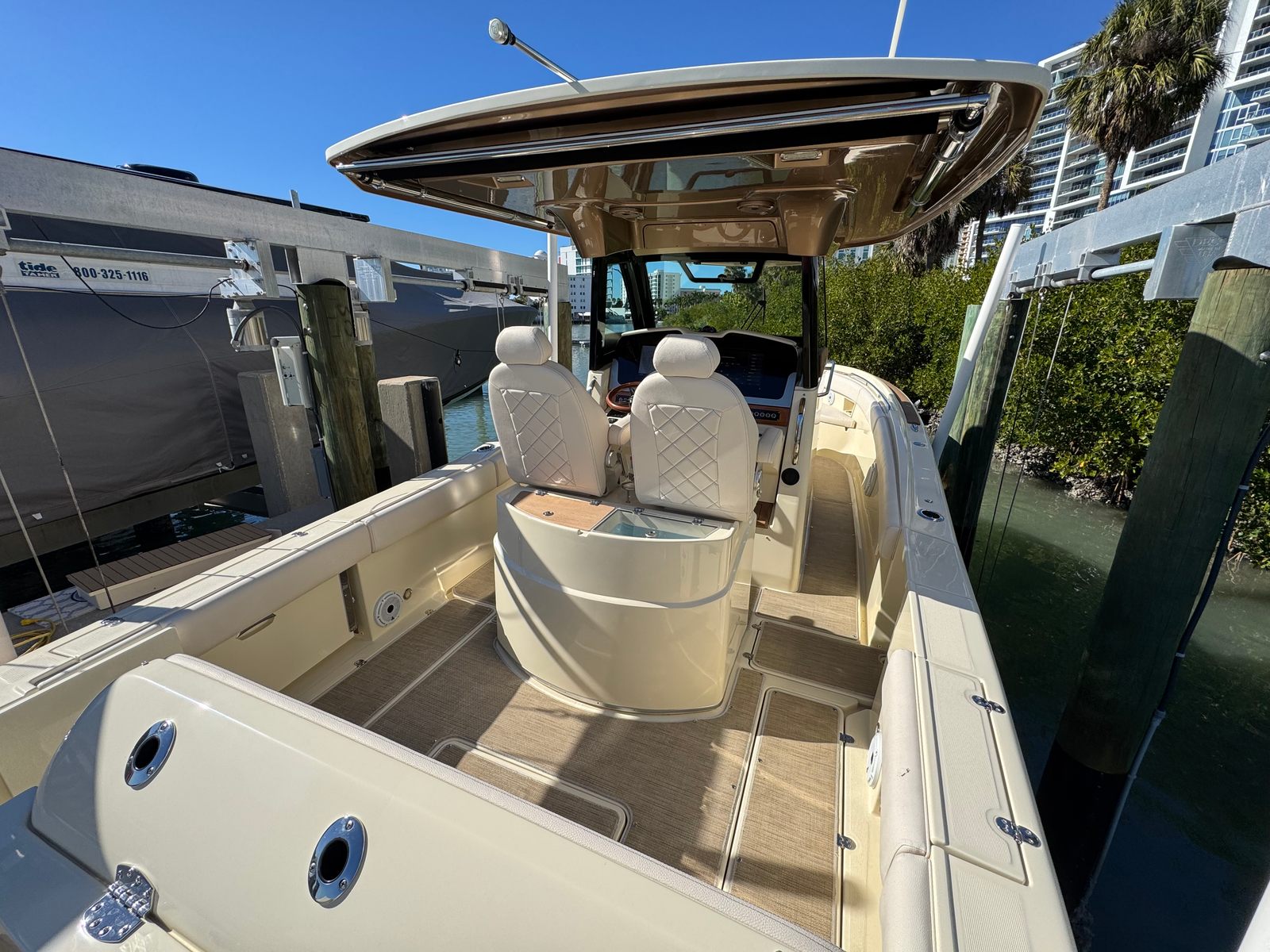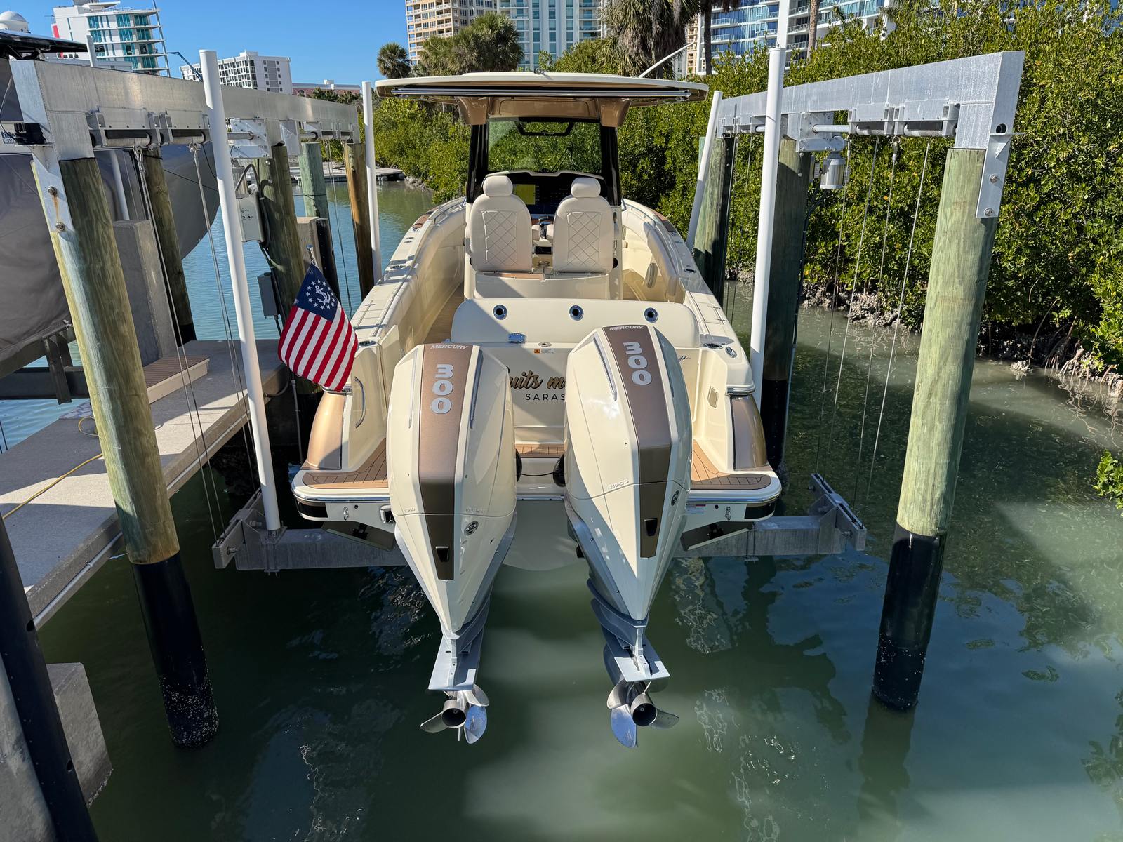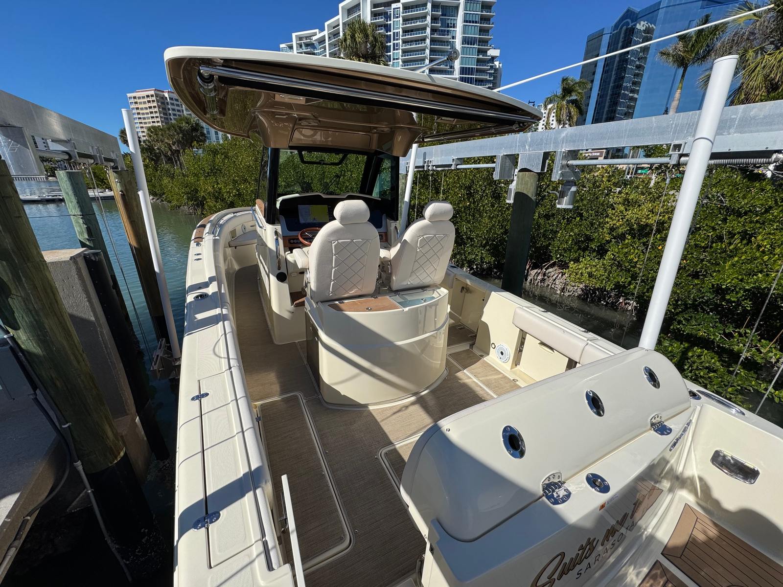 The expansive open bow offers dual forward-facing chaise loungers, as well as lavish wraparound bow seating. Convenience abounds with sealed, fully finished storage lockers in-floor and under the seats, plus well-placed cupholders for entertaining ease.