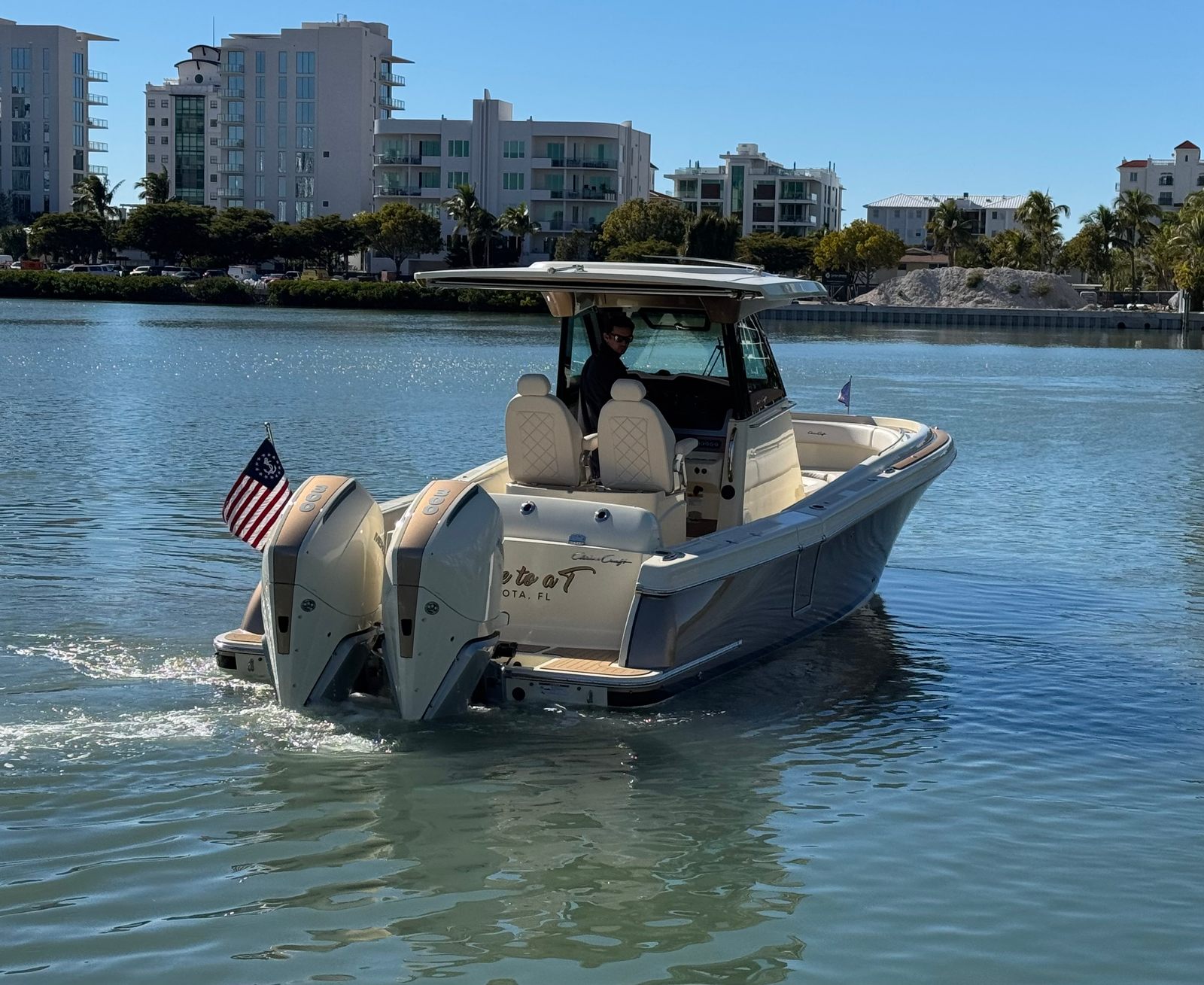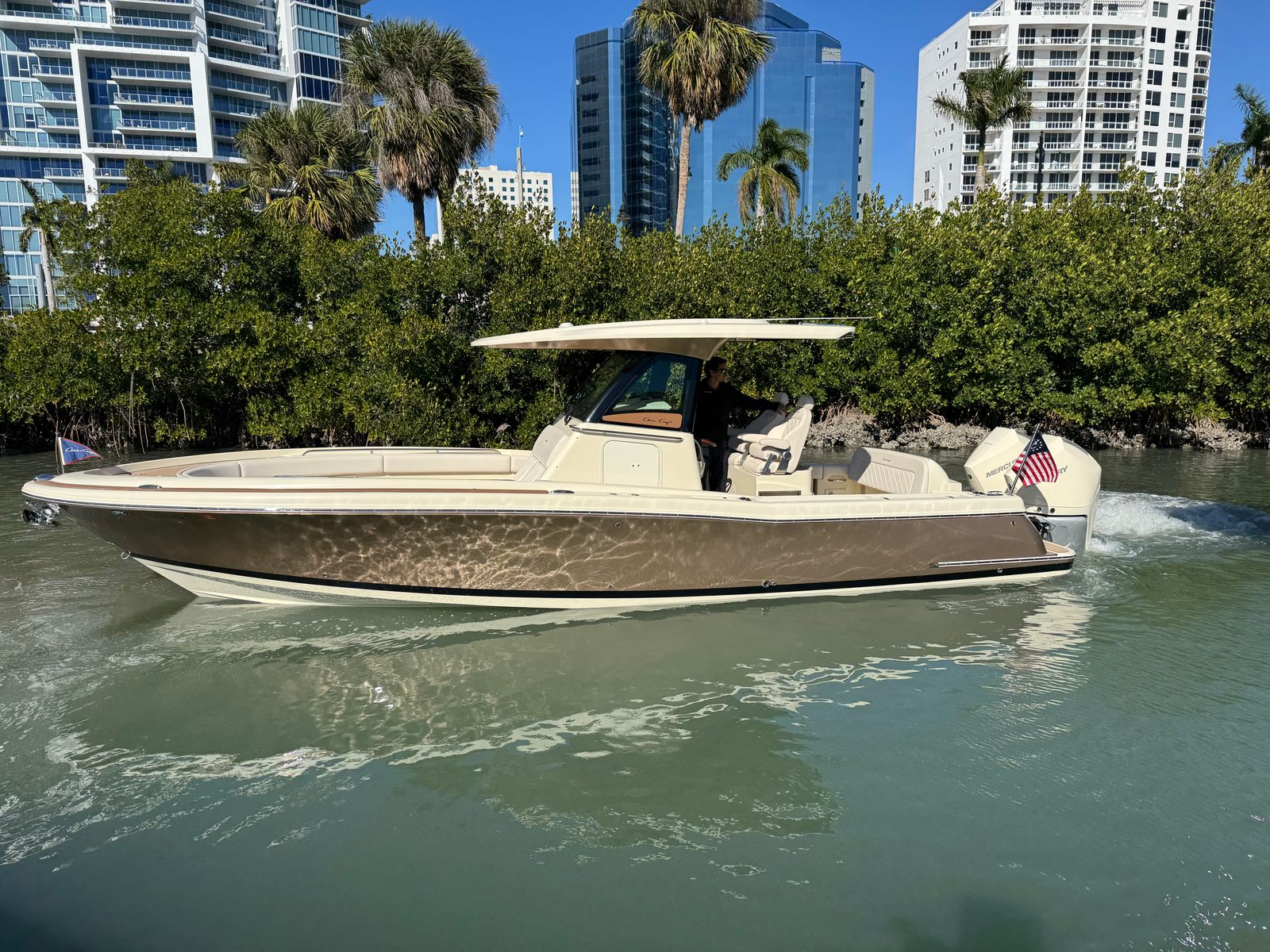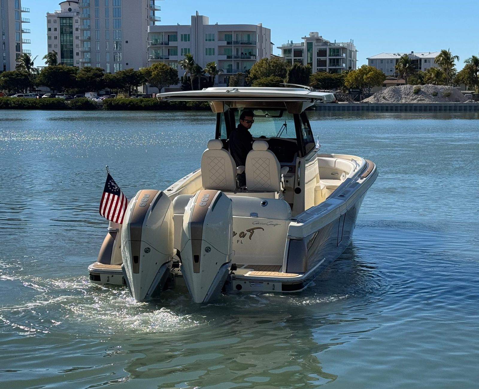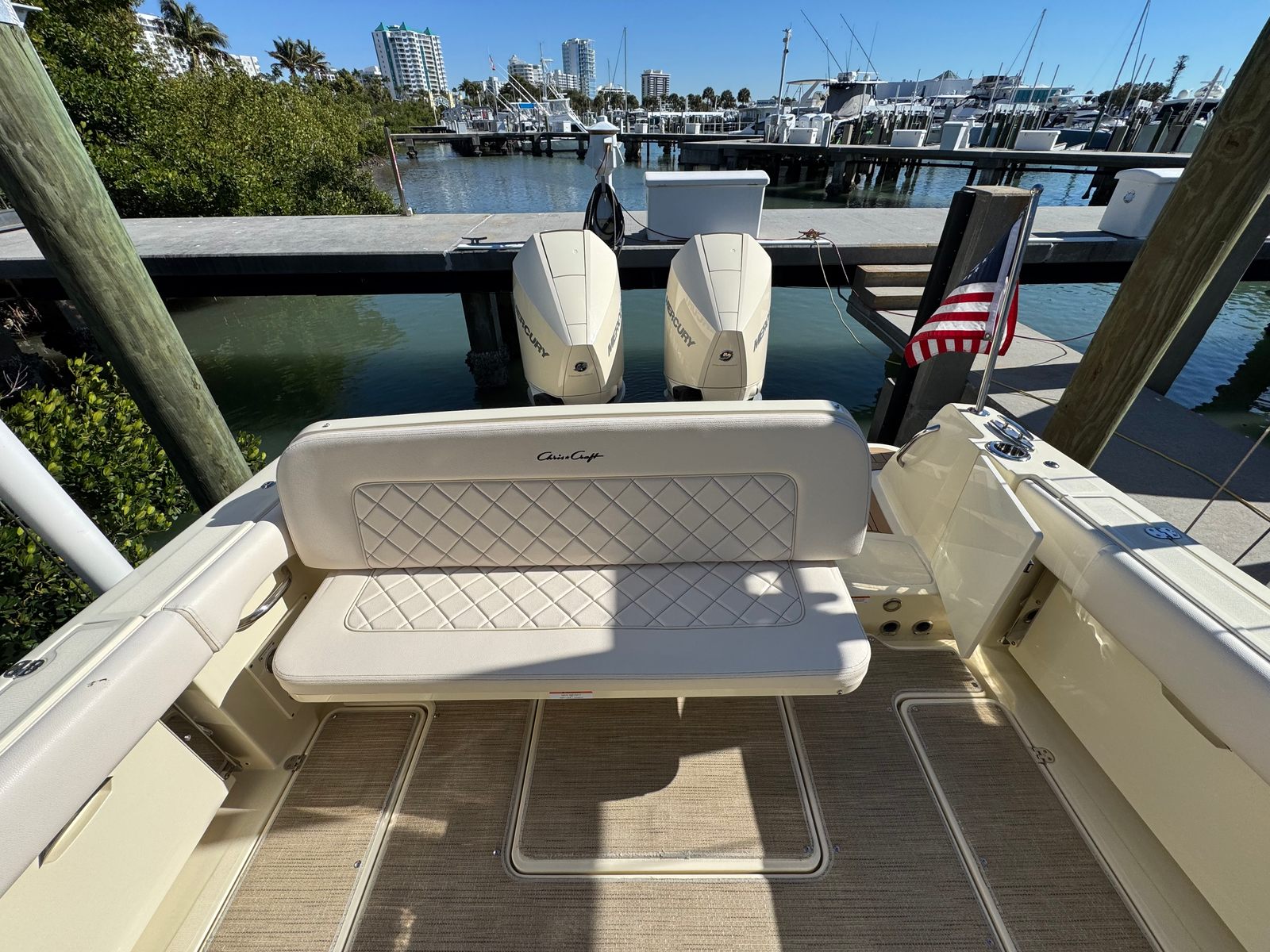 The expansive open bow offers dual forward-facing chaise loungers, as well as lavish wraparound bow seating. Convenience abounds with sealed, fully finished storage lockers in-floor and under the seats, plus well-placed cupholders for entertaining ease.