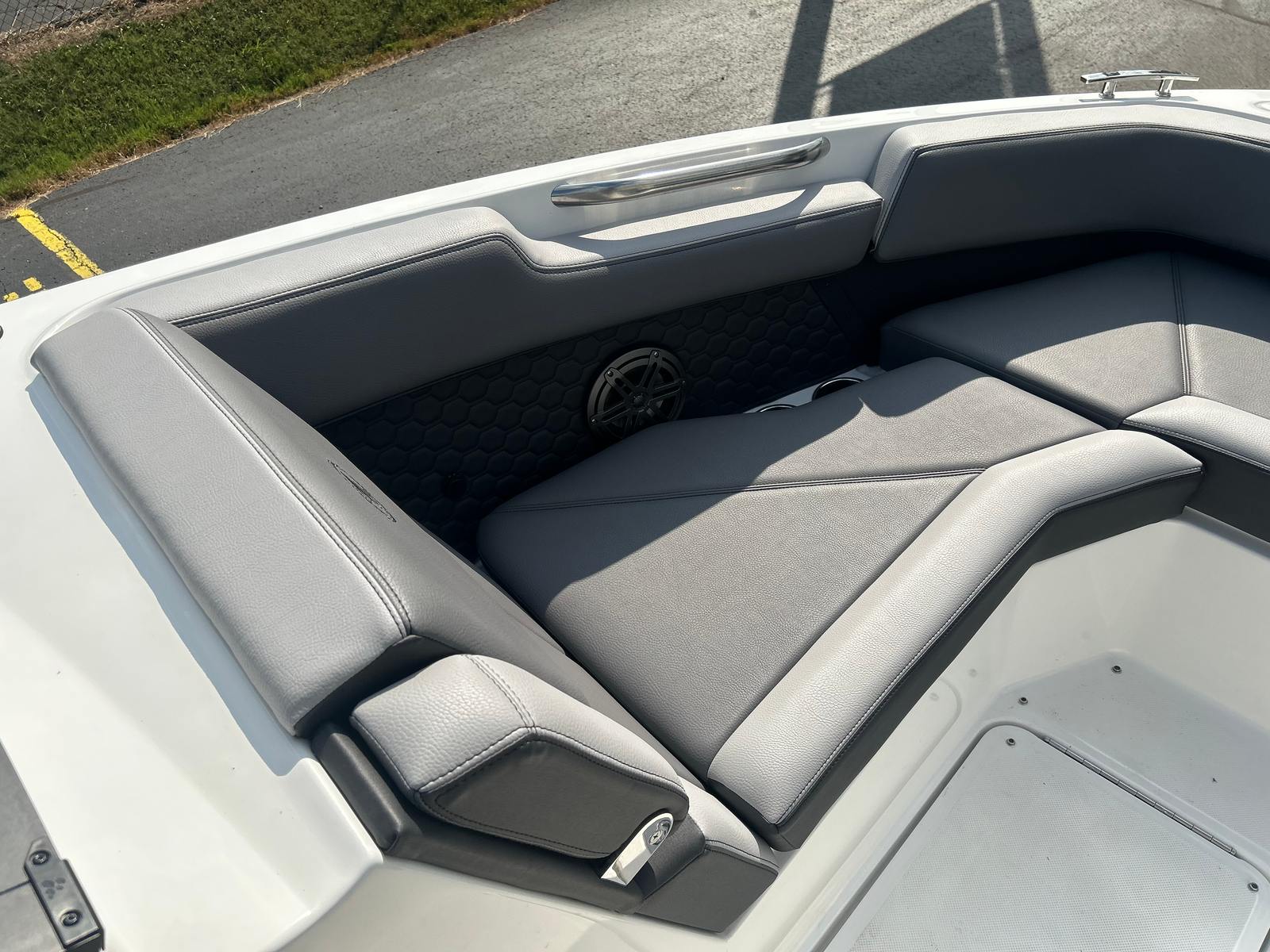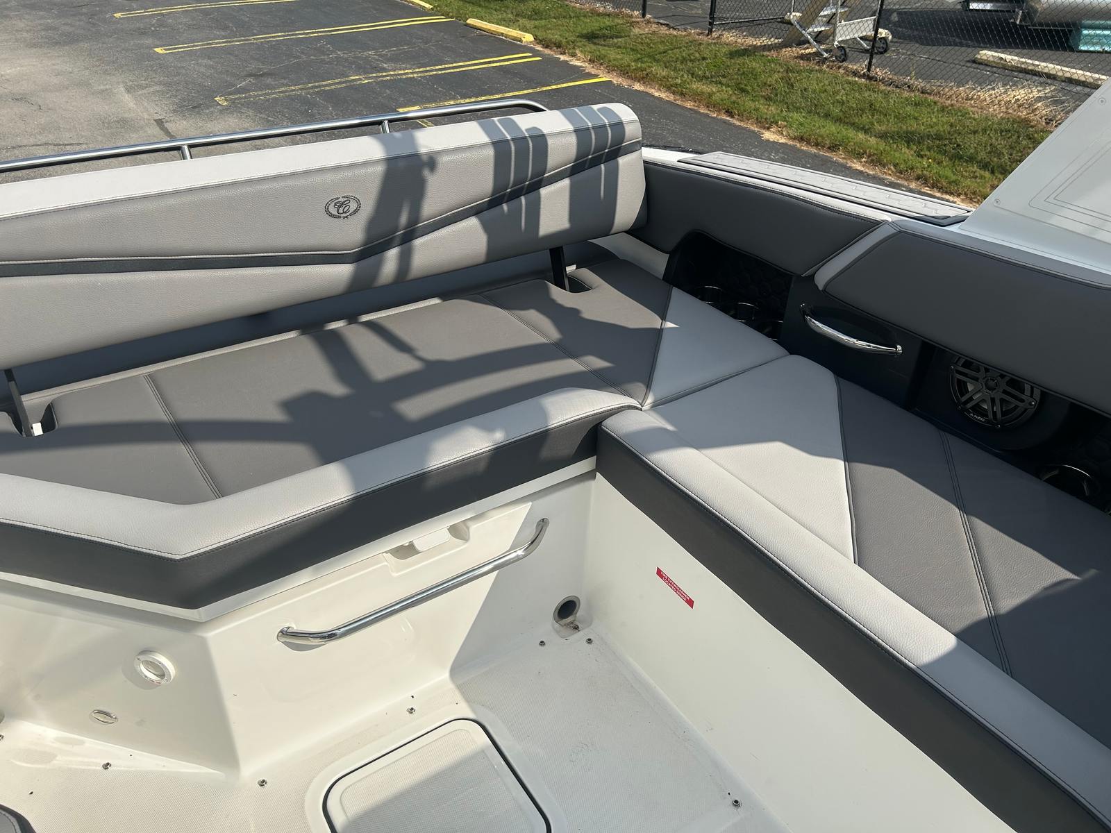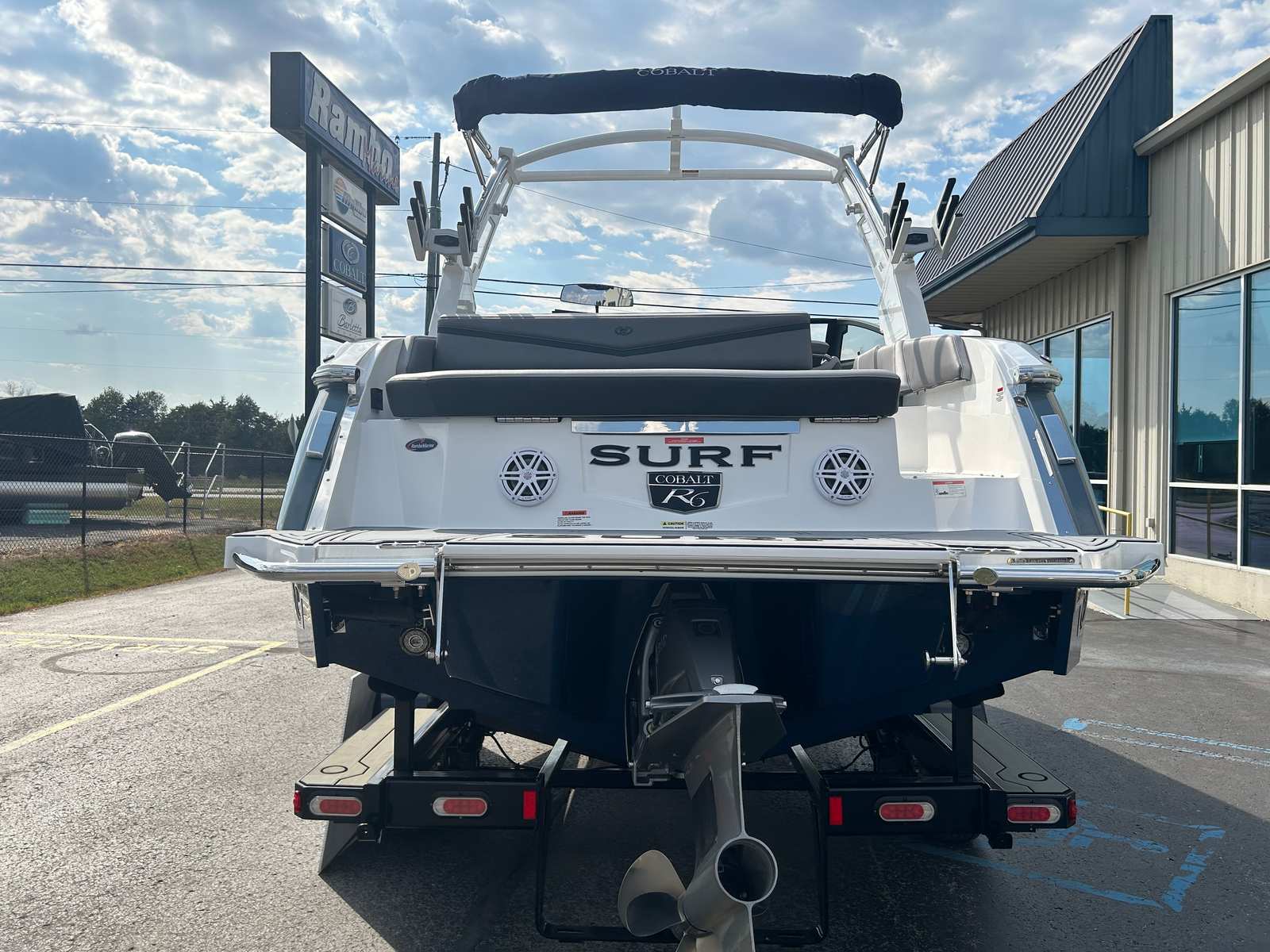 The Cobalt R6 Surf is engineered with a host of features designed to enhance your time on the water. Its spacious bowrider layout provides generous seating and lounging areas, perfect for socializing or soaking up the sun. The innovative hull design ensures a smooth, stable ride, while the advanced surf system allows for customizable wakes, making it a dream for wakeboarders and surfers alike. The R6 Surf’s premium upholstery, ergonomic helm, and intuitive controls create a comfortable and user-friendly environment for both captain and passengers.Additional features include a versatile swim platform, ideal for easy access to the water, and ample storage compartments to keep your gear organized and out of the way. The boat’s high-quality construction and attention to detail are evident throughout, from the stylish exterior to the thoughtfully designed interior spaces.