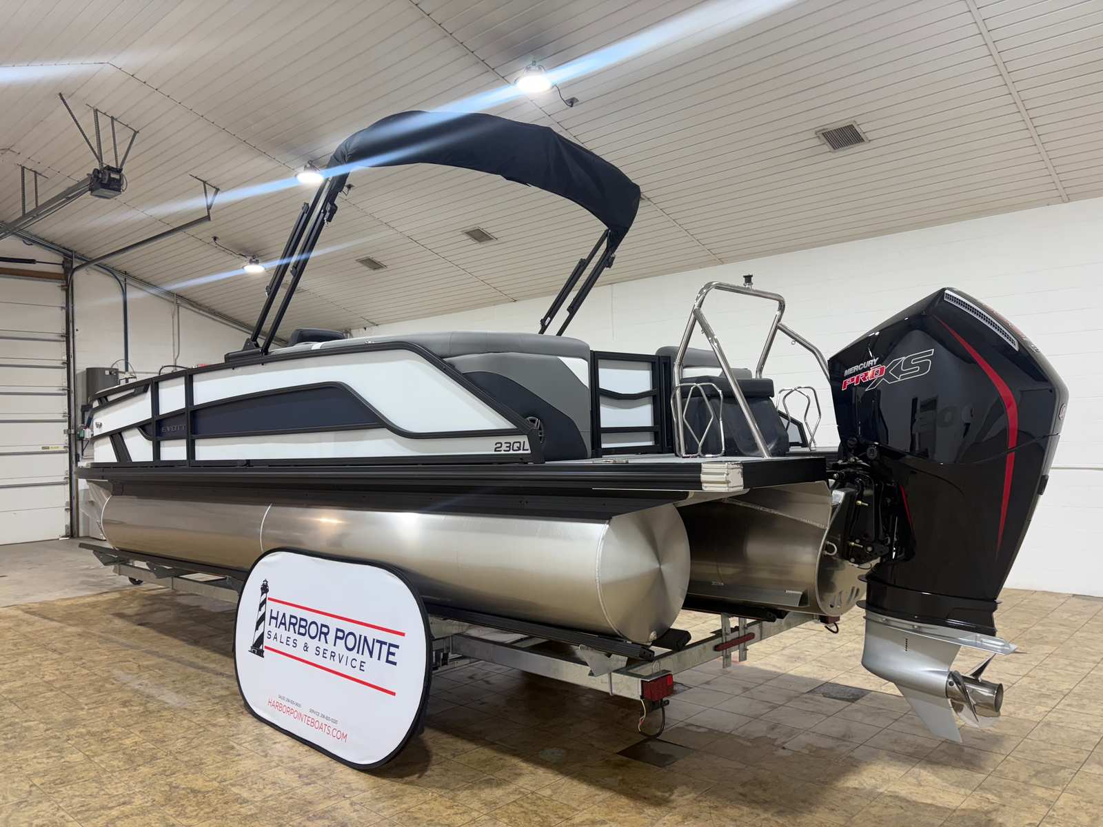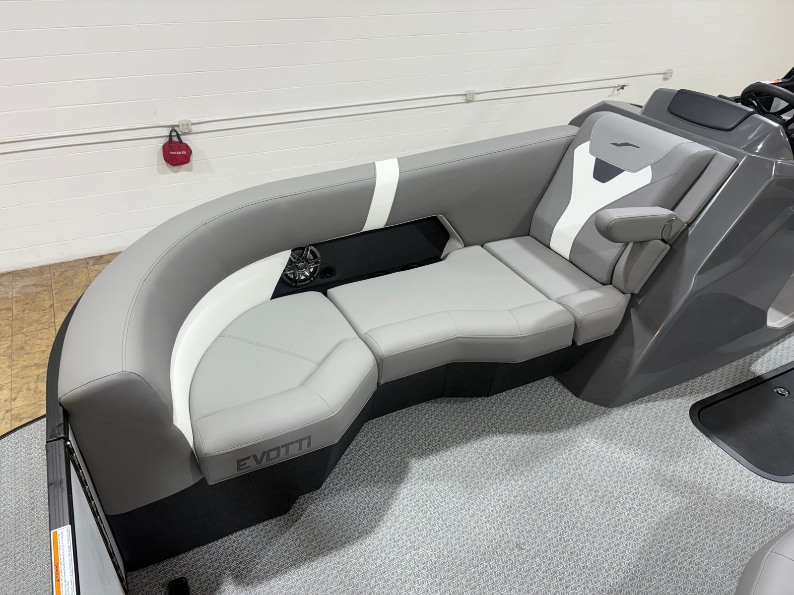 The 2026 Evotti 523 QL is packed with features that enhance both its aesthetic appeal and its functionality. The Base Vinyl Ghost White and Base Vinyl Steel Gray upholstery create a sophisticated and inviting atmosphere, while the Panel Pearl White Gloss and Panel Accent Platinum Blue Satin add a touch of modern elegance. The Steel Gray Evolution Flooring is not only stylish but also durable and easy to maintain, ensuring your pontoon remains pristine trip after trip.For those who appreciate high-quality sound, the Clarion Head Unit & Speakers provide crystal-clear audio, perfect for setting the mood or entertaining guests. Navigating your favorite waterways is a breeze with the Garmin 943 featuring 5" gauges, offering advanced navigation and easy-to-read information at your fingertips. The Canvas Black provides shade and protection from the elements, allowing you to enjoy your time on the water in comfort.