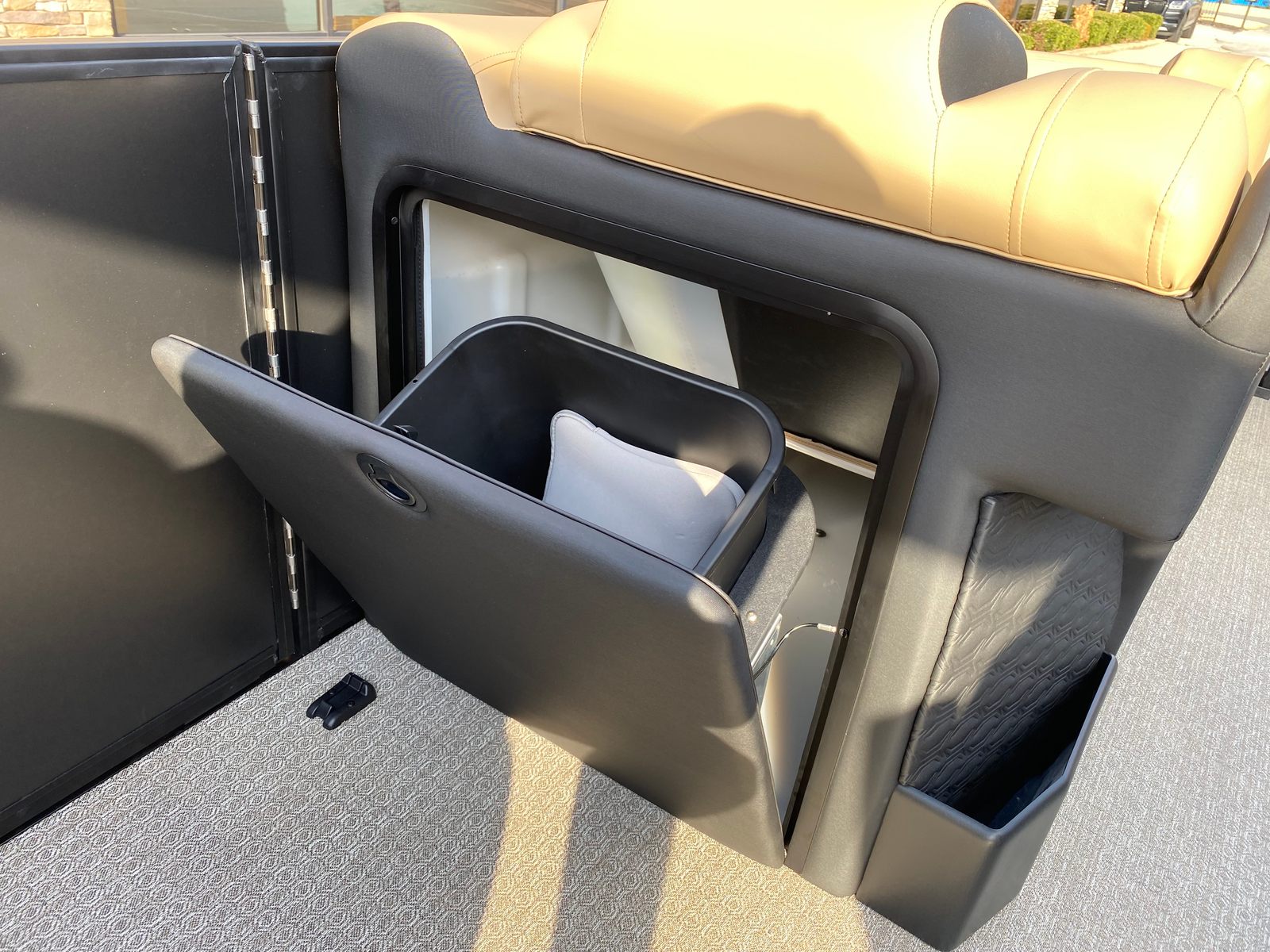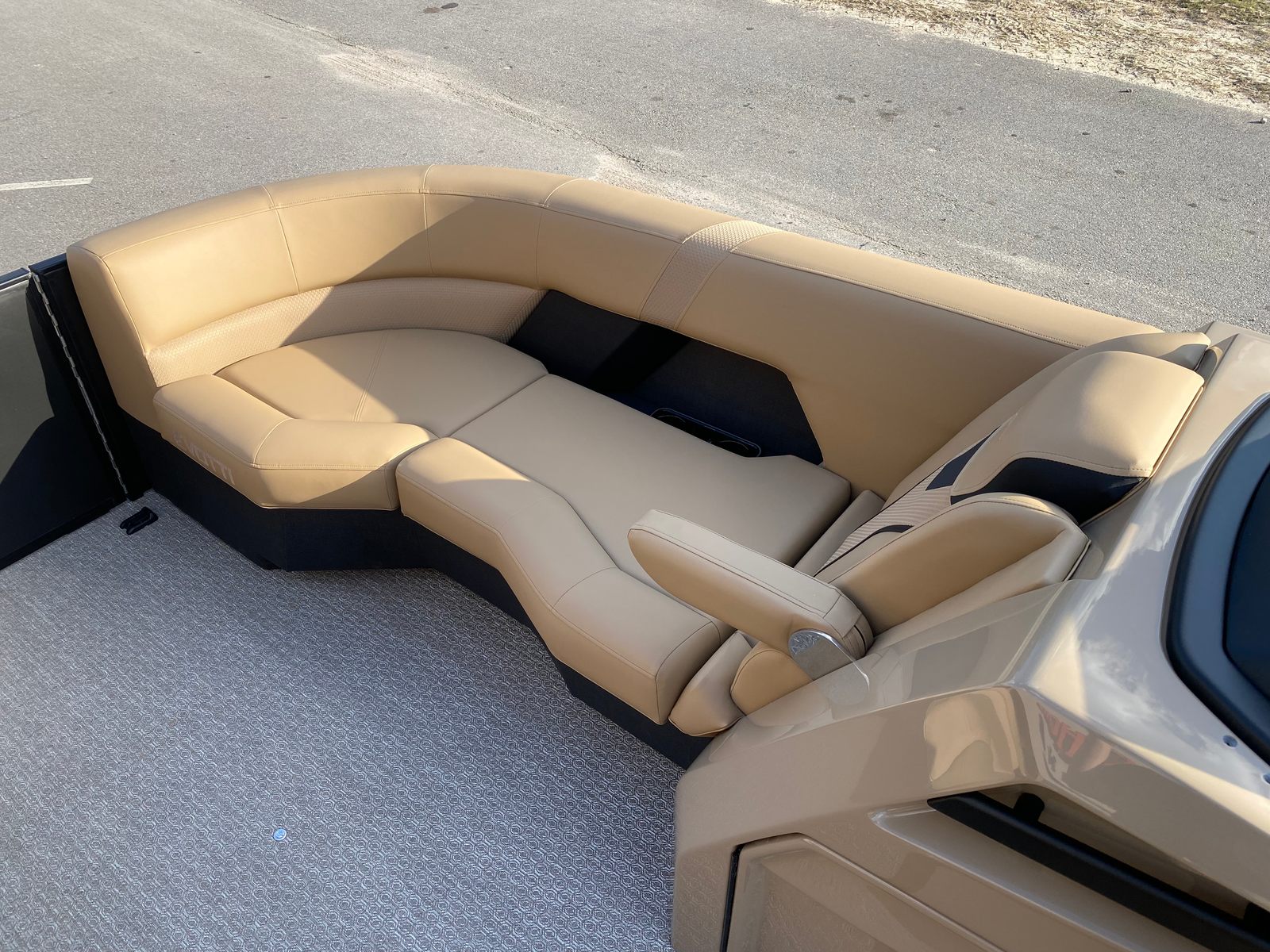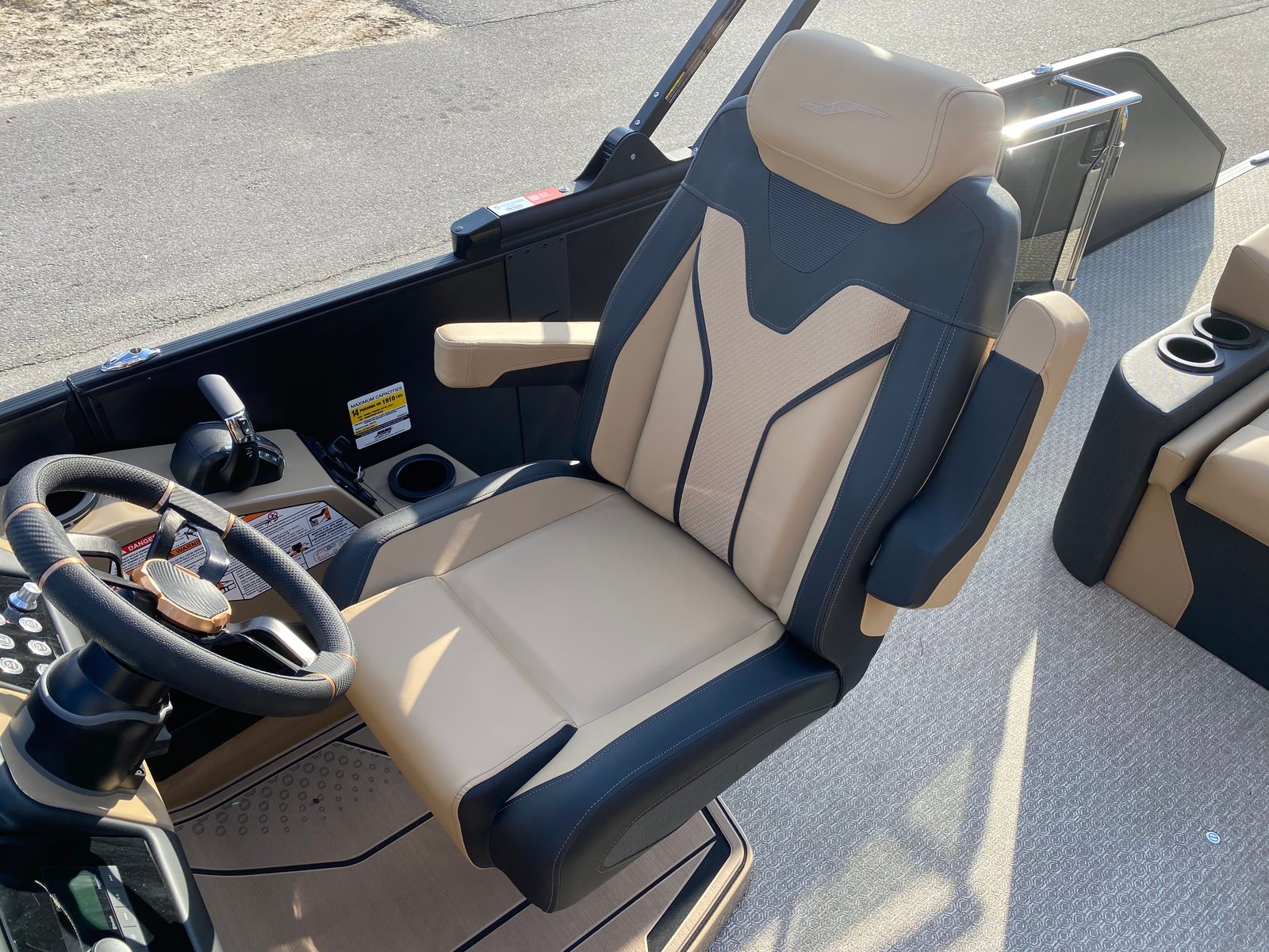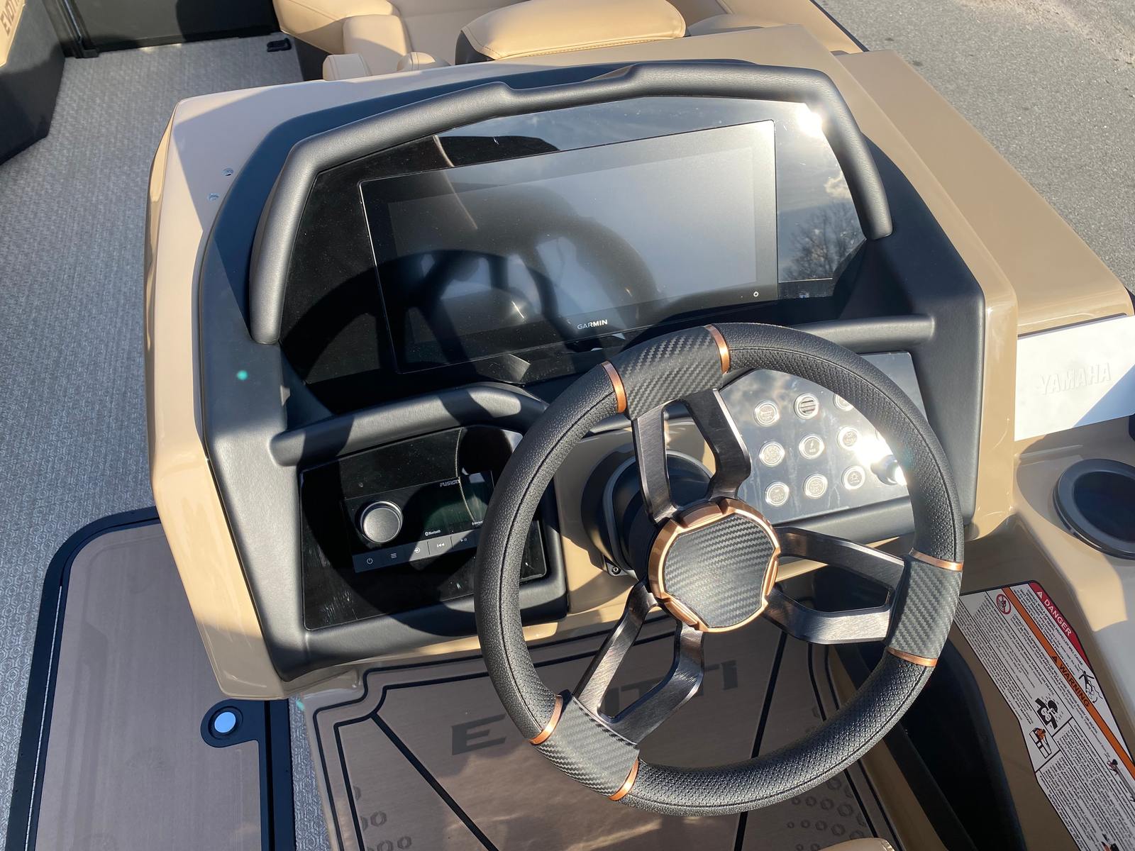 The Evotti 723 CS is loaded with premium features that set it apart from other pontoon boats for sale. The exterior boasts a sophisticated Panel Diamond Black Satin finish, complemented by a Panel Accent Pearl White Gloss that adds a touch of elegance and modern flair. The Canvas Black top provides shade and protection, allowing you to enjoy your time on the water regardless of the weather.Step aboard and you are greeted by Base Vinyl Roan Bronze seating, which offers both durability and a luxurious feel. The Roan Bronze Evolution Flooring not only enhances the aesthetic appeal but also provides a comfortable, non-slip surface that is easy to maintain. The 15" Ultra Wide Display at the helm puts navigation, system controls, and entertainment options at your fingertips, ensuring you stay connected and in command.For music lovers, the Fusion Head Unit paired with JL Audio speakers, subwoofer, and amplifier delivers an immersive sound experience, turning every outing into a floating concert. Whether you are hosting a lively party or enjoying a peaceful sunset cruise, the audio system ensures the perfect soundtrack for your journey.