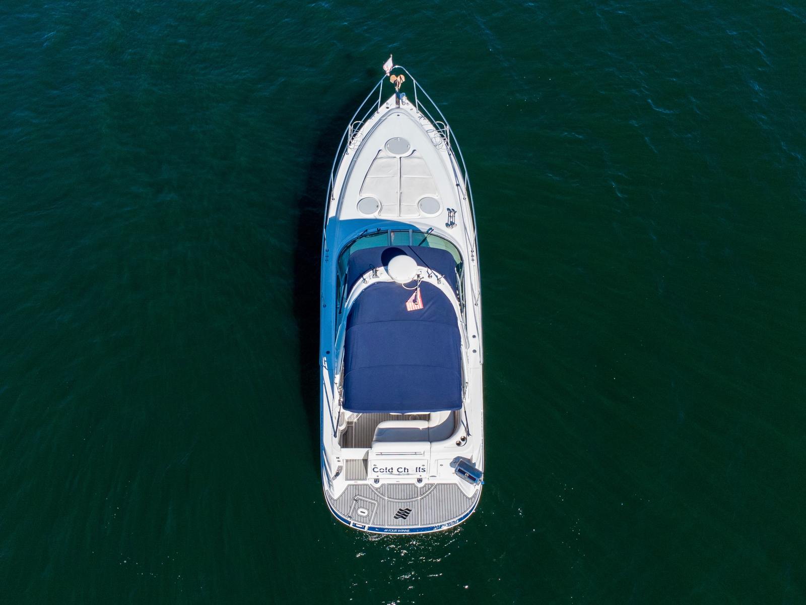 Designed for easy entertaining and comfortable cruising, the cockpit features a spacious U-shaped seating area, full SeaDeck flooring, and a center walk-through to the bow. A full camper canvas with isinglass enclosure and a cockpit cover provide flexibility and protection in any weather.