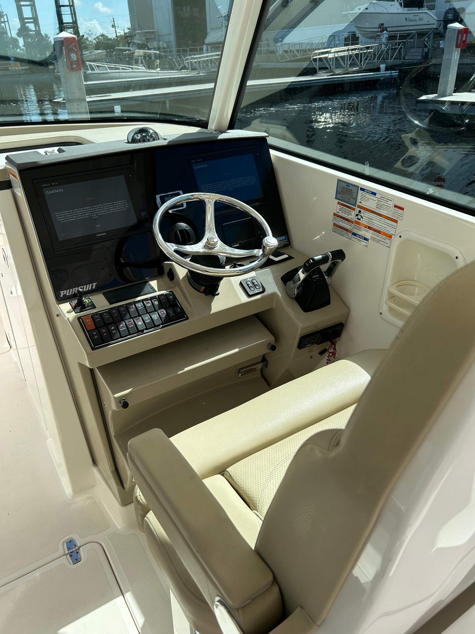 This Pursuit DC 325 Dual Console boat for sale is perfectly suited for a variety of on-water activities. Imagine setting out for a family day trip, with plenty of space for everyone to relax and play. The dual console design makes it easy to switch between cruising, fishing, and water sports, adapting to your group’s interests and needs. Anglers will appreciate the ample deck space and storage for tackle and gear, while those seeking relaxation can stretch out in the comfortable seating areas and soak up the sun. The DC 325 is also an excellent choice for luxury getaways, offering a stylish and well-equipped platform for exploring new destinations or enjoying quiet moments on the water.