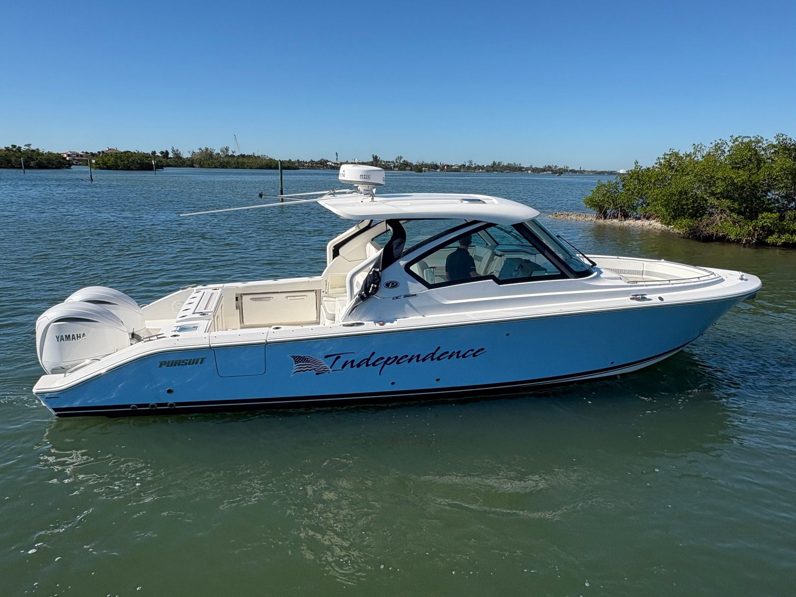 Experience exceptional performance and comfort with this 2023 Pursuit 326 DC, showing just 156 hours and loaded with premium equipment. Powered by twin Yamaha Digital F300 V6 Offshore engines with Yamaha Joystick Control, this versatile dual console delivers confident handling and effortless docking. A bow thruster and autopilot further enhance navigation and control.