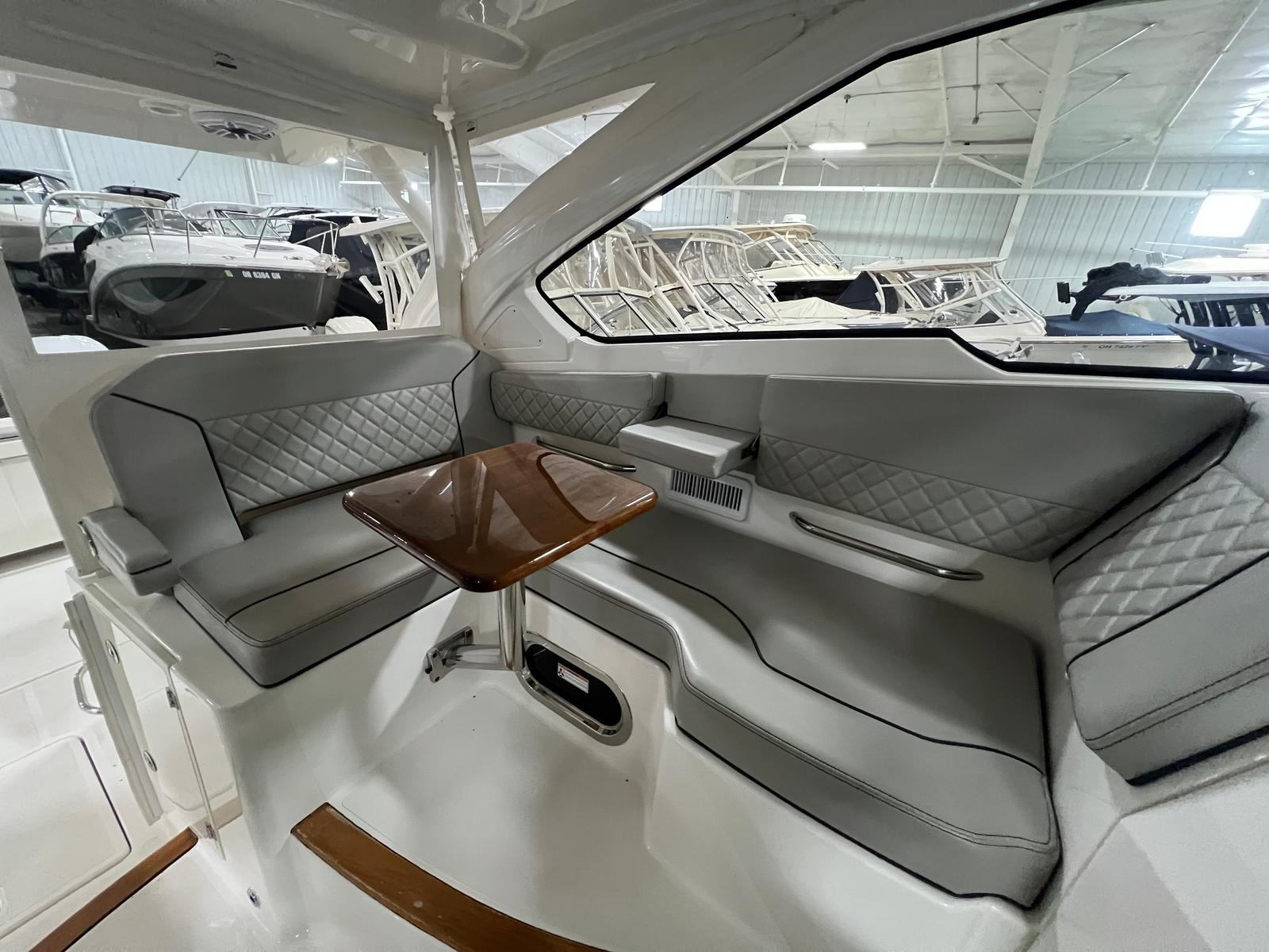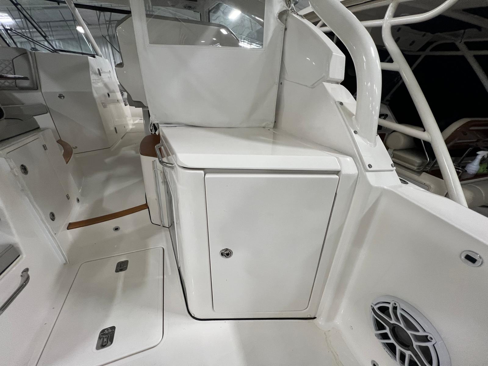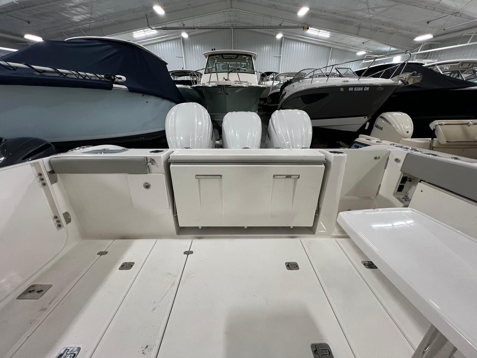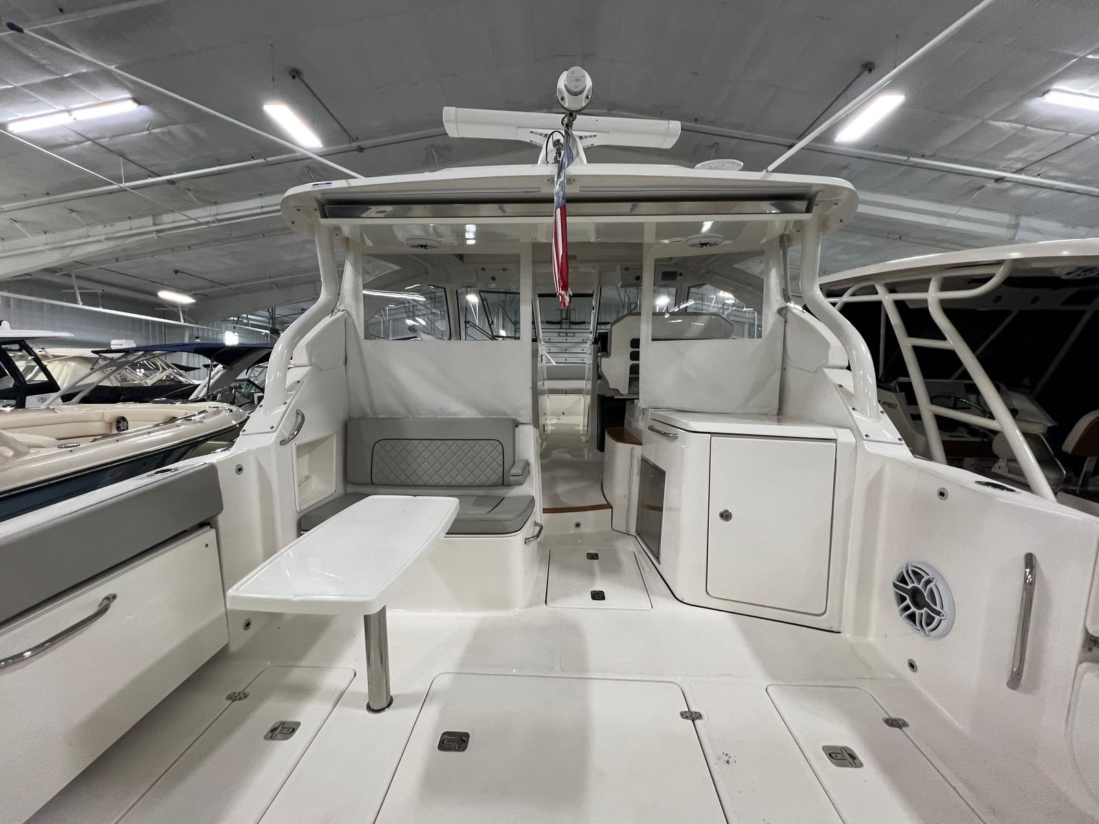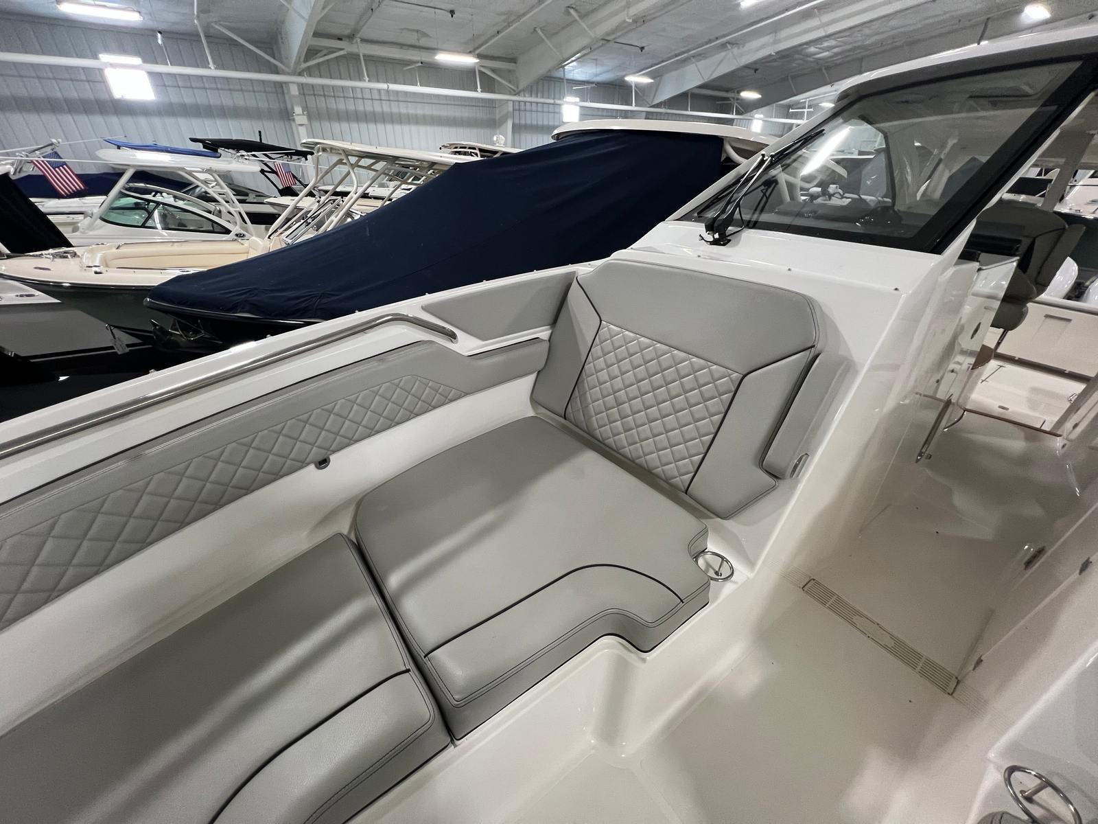 The Pursuit DC 365 is loaded with features that enhance comfort, convenience, and enjoyment on every outing. With six onboard batteries and a dedicated battery charger, you can count on reliable power for all your electronics and accessories. The aft bench seat provides a comfortable spot for guests to relax and take in the views, while the bow seating area is perfect for sunbathing or socializing at anchor.For those who love to entertain, the cockpit grill and wet bar transform the deck into a floating kitchen, allowing you to prepare and serve meals with ease. The double wide helm seat ensures that both captain and companion can enjoy the ride in comfort, while the hard top offers protection from the elements, extending your boating season and keeping everyone shaded on sunny days. Cockpit coaming bolsters add an extra layer of comfort and safety, especially during active pursuits like fishing or water sports.