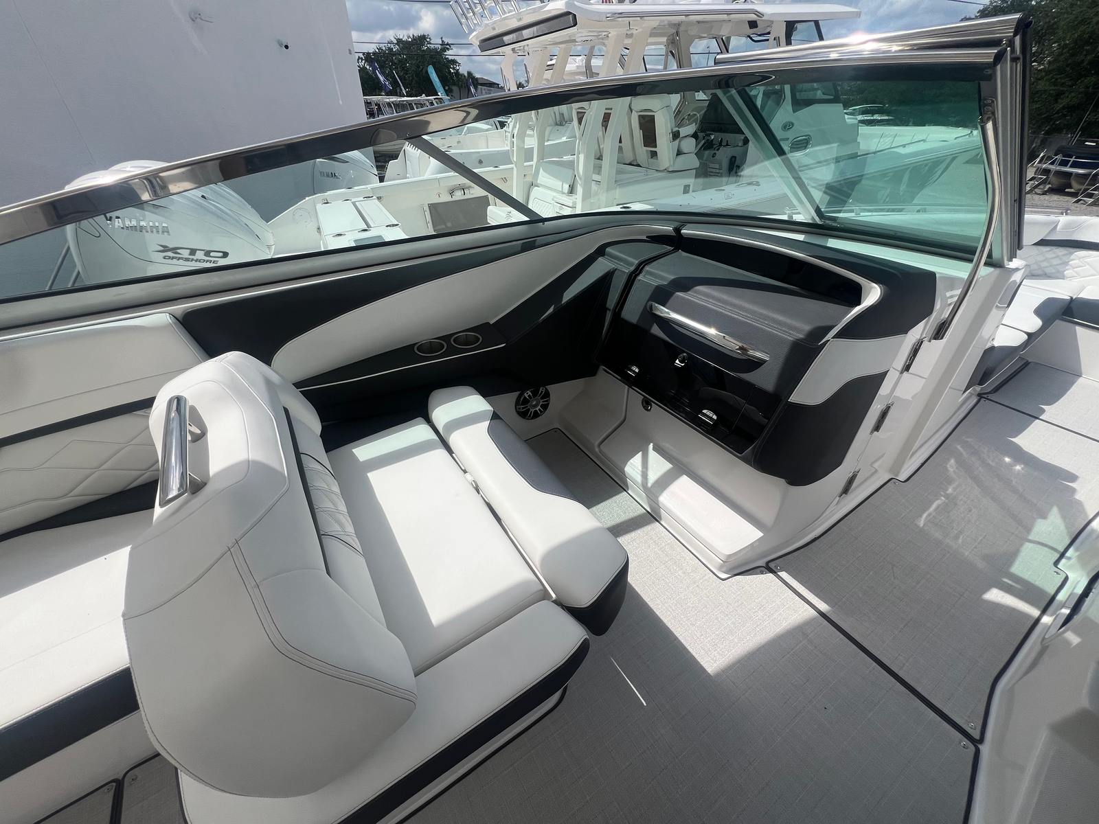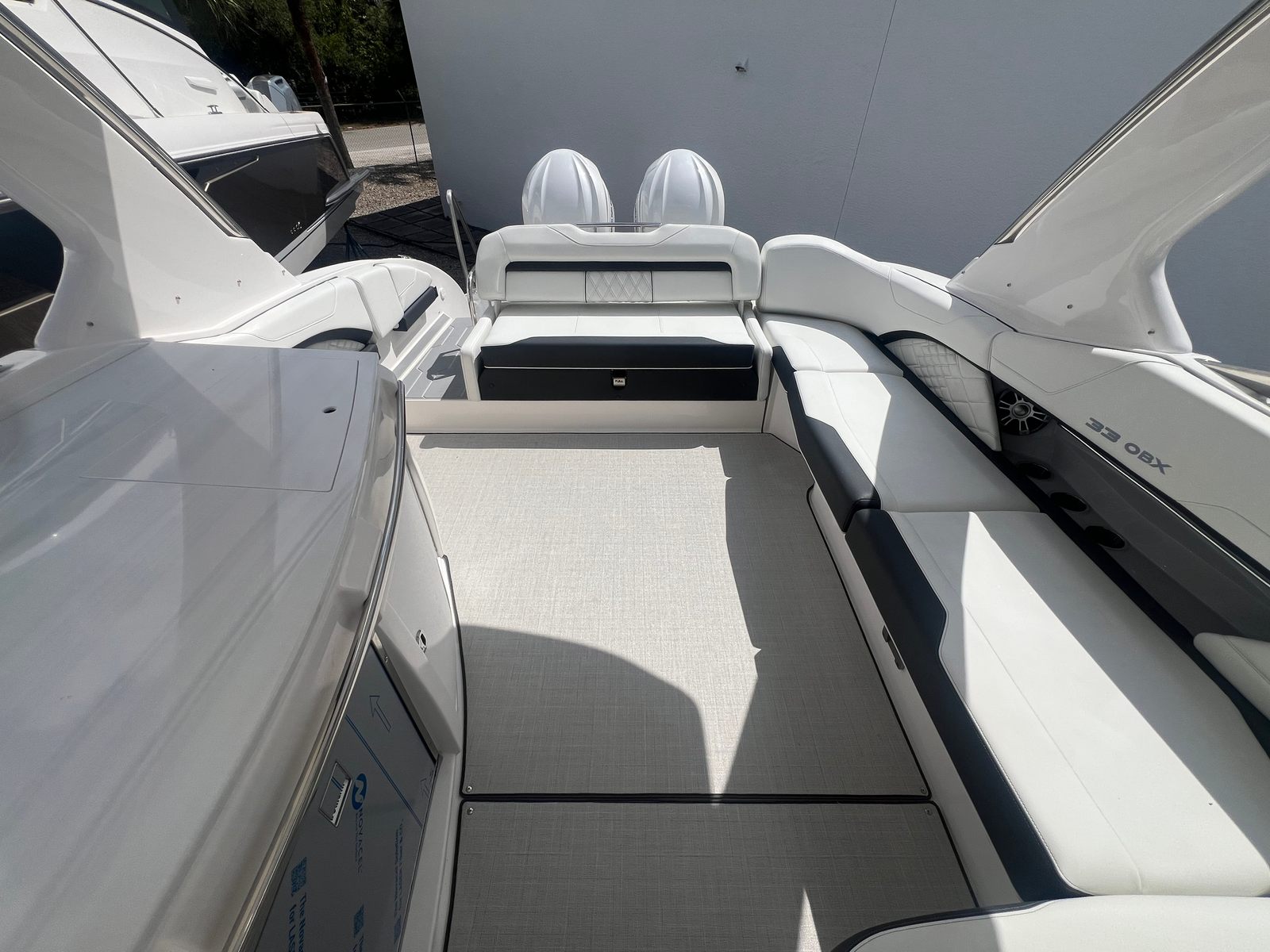 The Regal 33 OBX is designed with practicality in mind, making ownership easy and enjoyable. The twin engines not only provide powerful performance but also enhance maneuverability, simplifying docking and close-quarters navigation. The bow and cockpit covers protect your investment from the elements, reducing maintenance and preserving the boat’s pristine appearance.The hard top with sunroof and aft cockpit electric Sureshade offer flexible options for sun protection, allowing you to adapt to changing conditions with ease. The starboard windshield wiper ensures clear visibility during inclement weather, while the electric toilet with pump-out fittings adds convenience for longer journeys. With ample storage throughout the boat, you’ll have plenty of space to stow gear, water toys, and personal items, keeping the deck clutter-free and organized.