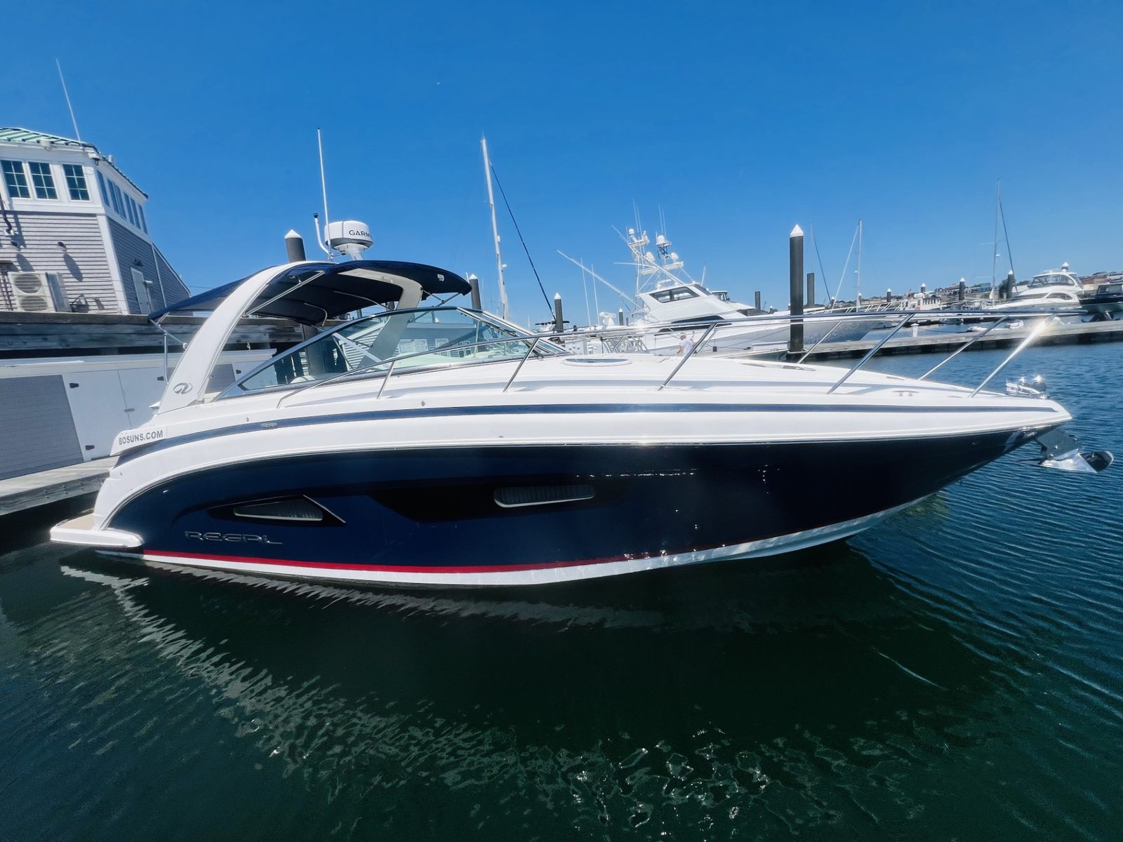The Regal 33 XO is loaded with special features designed to enhance your boating experience. Navigation is effortless with the Garmin 1243xsv and B60 transducer, providing clear and accurate data for safe passage. The Garmin HD Closed Array Radar adds an extra layer of confidence, especially when venturing out in challenging conditions. For anglers, the two rod holders offer convenient storage and accessibility, while the swim platform cleats make docking and water activities a breeze.Underwater lighting in vibrant blue creates a captivating ambiance for evening cruises, transforming the water around your boat into a glowing spectacle. The companionway screen door ensures fresh air and comfort while keeping pests at bay. Relax in style on the foredeck sunpad, perfect for soaking up the sun or enjoying a quiet moment with a view. Fender clips—six in total—make securing your boat simple and efficient, while the anchor windlass with chain and rope allows for easy anchoring in your favorite spots.The stainless steel upgrade throughout the boat not only adds a touch of elegance but also ensures durability and resistance to the elements. Every feature is thoughtfully integrated to provide maximum enjoyment, safety, and convenience for you and your guests.