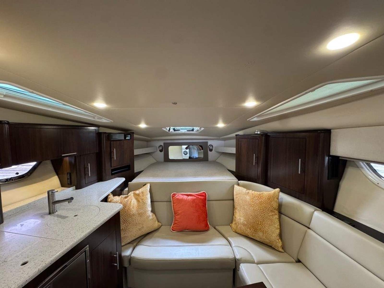 The hard enclosure and retractable hardtop have made the 35 Sport Coupe the #1 selling sport cruiser in its class. This design allows year-round boating in comfort, regardless of temperature. The cockpit is arranged for entertaining without leaving the party. On the starboard side, you’ll find a full wet bar with freshwater sink, smokeless grill, refrigerator, and ice maker, all within easy reach.