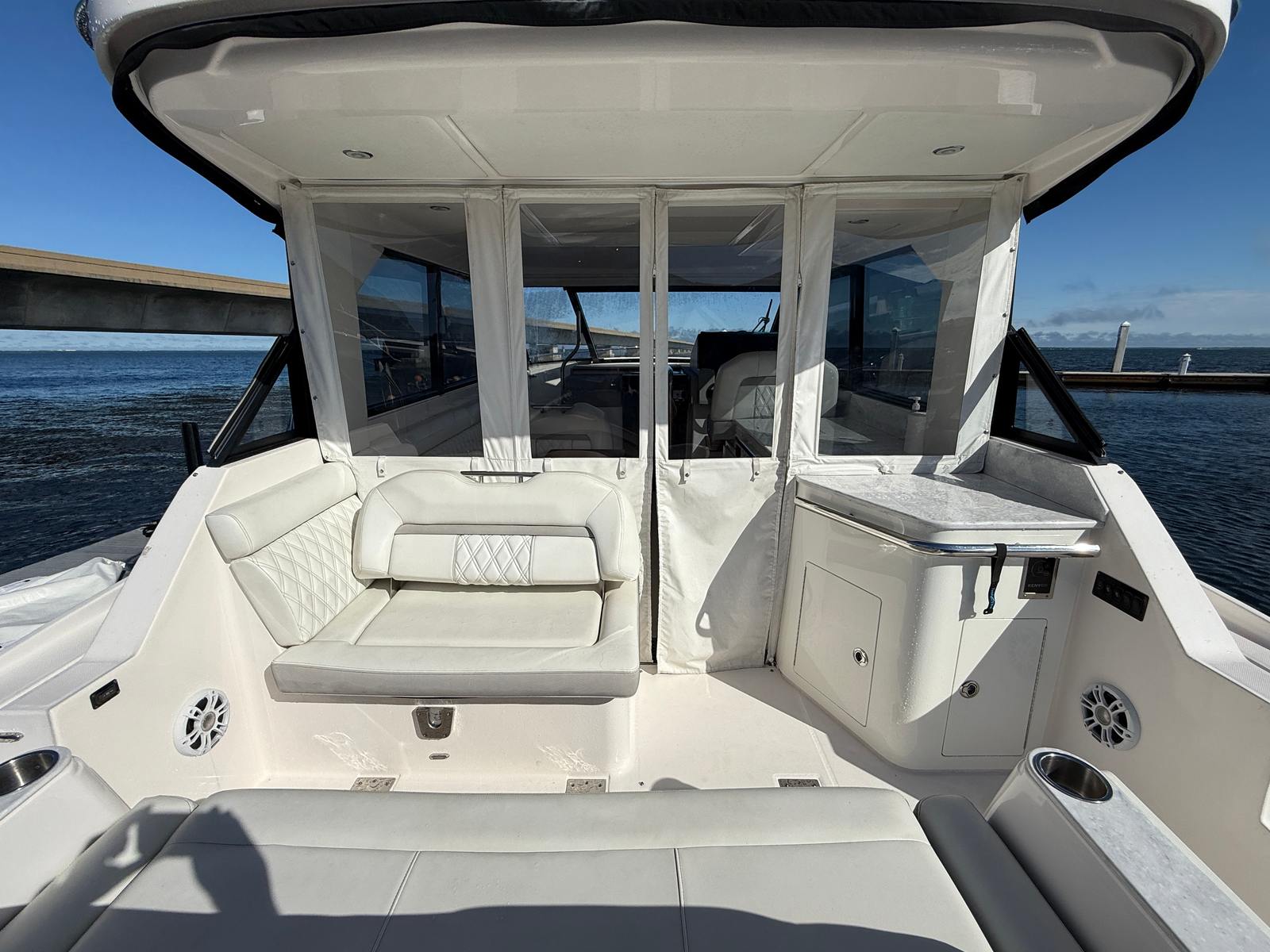 Under the hood, the 2021 Regal 36 Grande Coupe is powered by twin engines, delivering a combined 700 horsepower. With 528 engine hours, these engines have been well maintained and are ready to provide reliable performance for many more adventures. The robust powertrain ensures smooth acceleration, responsive handling, and the ability to cruise effortlessly at a variety of speeds. Whether you are navigating open waters or docking at your favorite waterfront restaurant, the 36 Grande Coupe offers the confidence and control you expect from a premium cruiser boat for sale.
