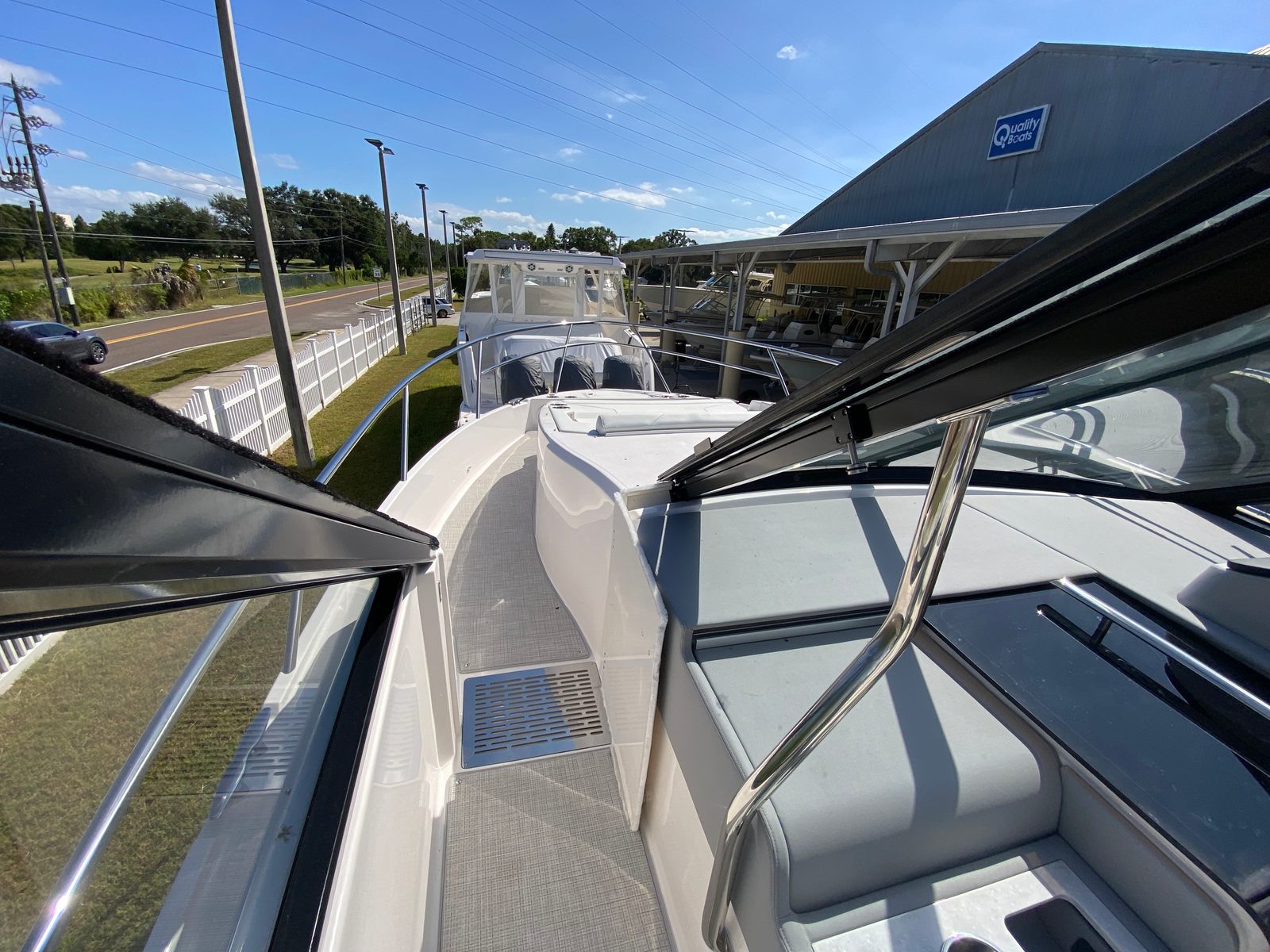 The 2026 Regal 36 XO is a testament to modern yacht design, offering a harmonious blend of elegance and functionality. Measuring an impressive 37.25 feet in length, this new yacht provides ample space for relaxation, entertainment, and adventure. The striking Tahiti Beach White hull, complemented by a bold black bootstripe and matching bottom color, ensures that this yacht commands attention in any marina or on open water. The Titanium interior adds a sophisticated touch, creating a welcoming and luxurious environment for you and your guests.