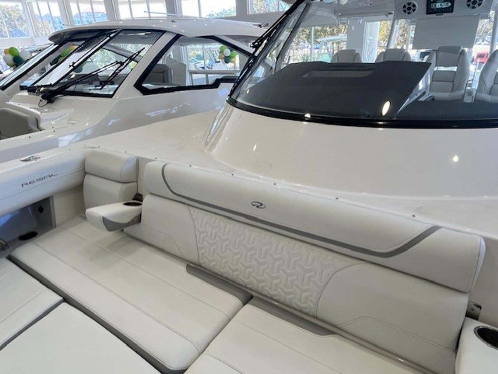 The Regal 38 SAV is a showcase of innovation and style, offering a host of features designed to maximize comfort and enjoyment. The exterior boasts a Steel Gray hull with a Graphite boostripe, complemented by a Tahiti Beach White bottom for a modern, elegant look. Step inside to discover a meticulously crafted interior, where six distinct color zones alternate between Pure White and Lunar Gray, creating a serene and inviting atmosphere. Each color zone is thoughtfully placed to enhance the yacht’s spaciousness and visual appeal, making every moment onboard feel special.