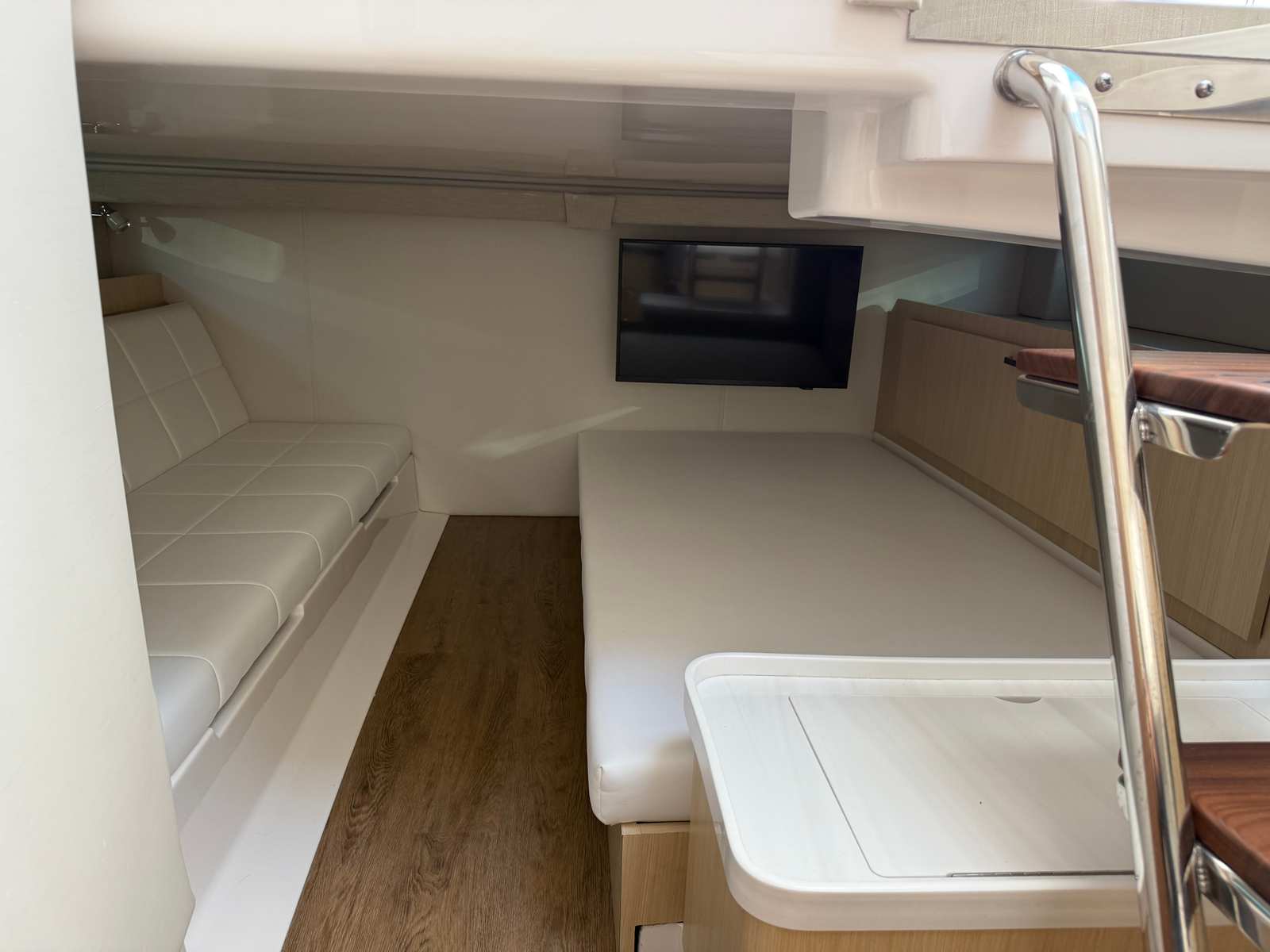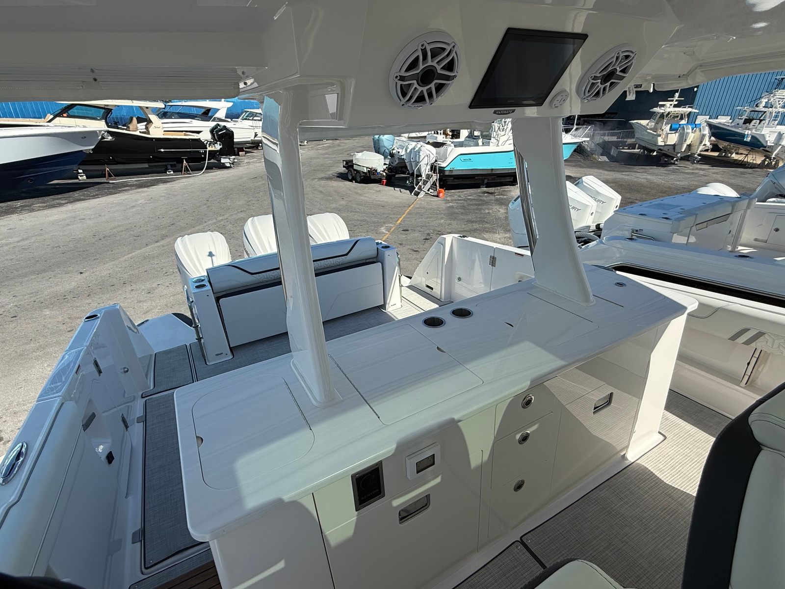 The Regal 38 SAV is packed with special features that elevate your boating experience to new heights. The triple Yamaha F300NSB2 engines provide unmatched power and efficiency, while the integrated steering system ensures precise control. The hull’s Steel Grey finish, Graphite bootstripe, and Tahiti Beach White bottom create a visually stunning exterior that reflects Regal’s commitment to quality and style. The multi-zone color scheme, featuring Pure White, Graphite, Lunar Grey, and Graphite Grey, adds depth and character to the yacht’s appearance, making it a true standout on the water. Every detail of the Regal 38 SAV is crafted to enhance both aesthetics and functionality, ensuring you enjoy every moment aboard.
