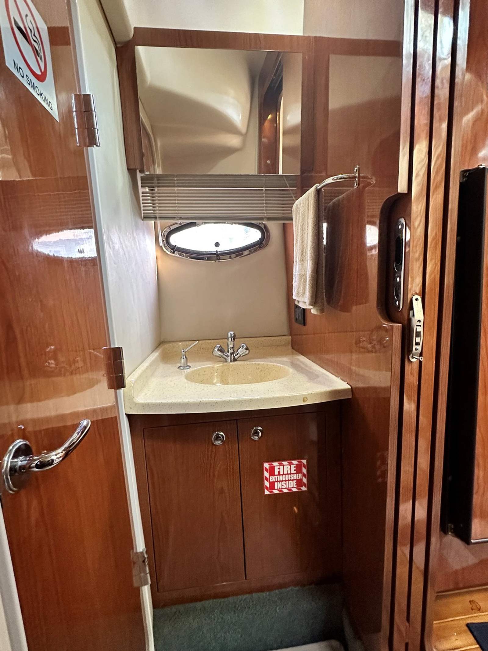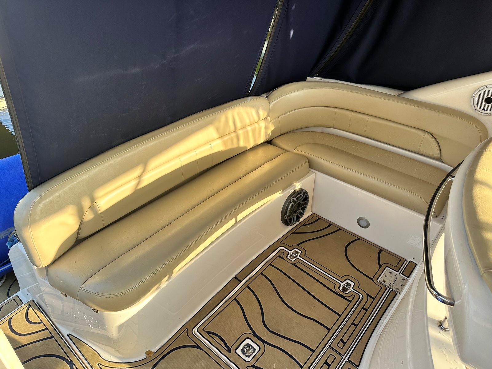 Salon • Chrome Overhead Lighting With Dimmer • Removable dinette table • Overhead Skylight Hatch With Blinds and Screen • Recliner Seating Galley • Hardwood Flooring • Corian Countertops • Stainless Steel Sink • Electric Stove (2 Burner) • Microwave • Nova Kool Refrigerator and Freezer Combo (7.5 Cubic Ft.) • 11 Gallon Waste Receptacle Forward Stateroom and Head • Inner Spring Mattress With Storage Underneath • Overhead Hatch • Two Hanging Lockers With Cedar Lining • Double-wide Sliding Privacy Door • Vacuflush Toilet • Full Fiberglass Stand-Up Head With Settee • Cultured Marble Floor • A/C Vent • Carbon Monoxide Detector Mid Cabin Stateroom and Head • Twin Beds Convert to Queen Size Berth • Overhead Vanity Cabinet • Under Mattress Storage • Full Fiberglass Head Compartment With Stand-up Shower • Vacuflush Toilet • Garmin 820xs With 8" Color Screen and HD-ID, CHIRP and DownVü with CHIRP Sonar Technology • Raymarine AutoPilot System and Depth Sounder • Raymarine VHF • Abyss Underwater Lighting • Fusion Apollo Stereo System With JL Audio and Fusion Speakers