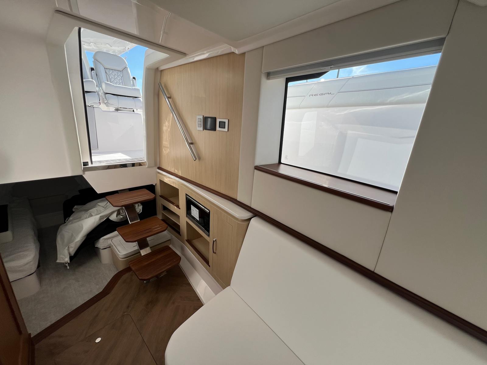 Beyond its luxurious amenities, the Regal 43 SAV is engineered for practical and convenient ownership. The bow thruster simplifies docking, allowing you to maneuver with confidence even in crowded marinas or challenging conditions. The bow boarding handle adds an extra layer of safety and ease, making it simple for everyone to get on and off the yacht.The diesel generator ensures you have all the power you need for extended stays on the water, supporting everything from air conditioning to entertainment systems. The white canvas offers protection from the sun and rain, while the ultimate underwater lighting enhances visibility and safety during nighttime excursions. With its spacious layout and smart storage solutions, this yacht makes it easy to bring along all your essentials for a day trip or a longer adventure.