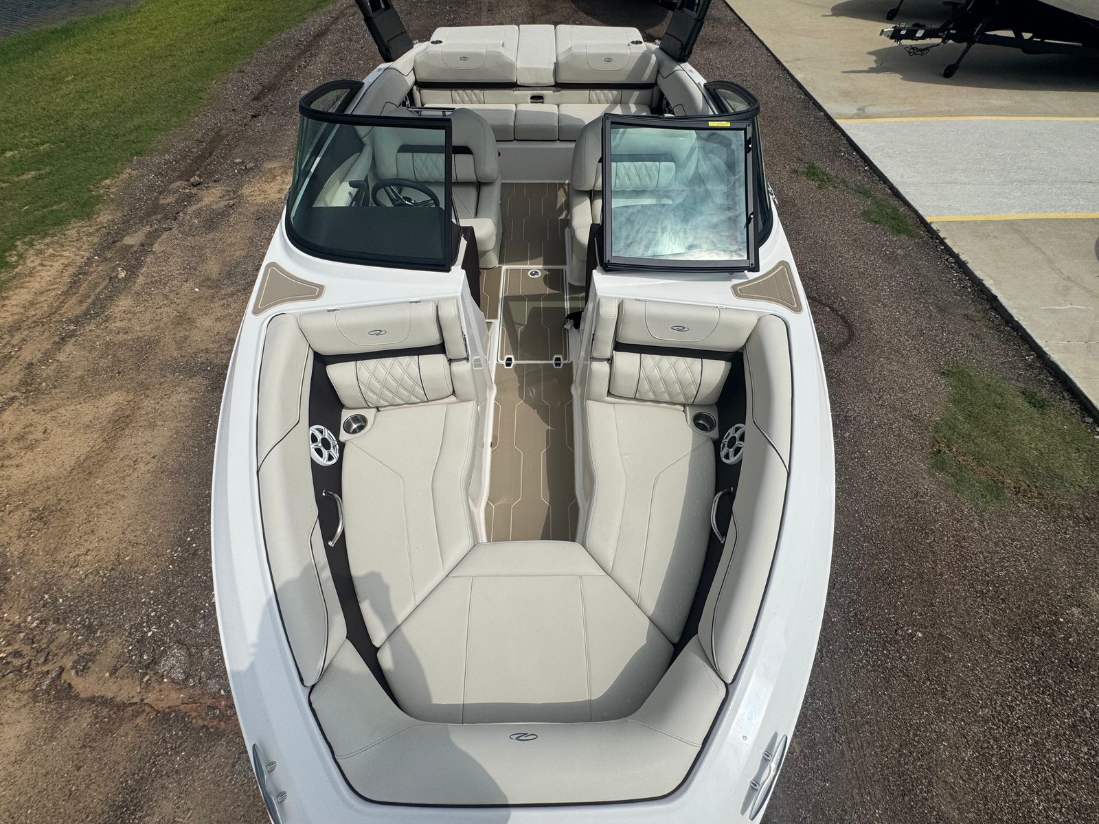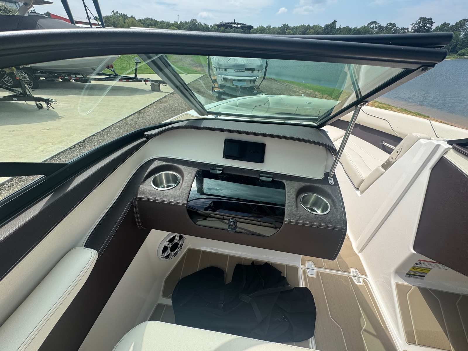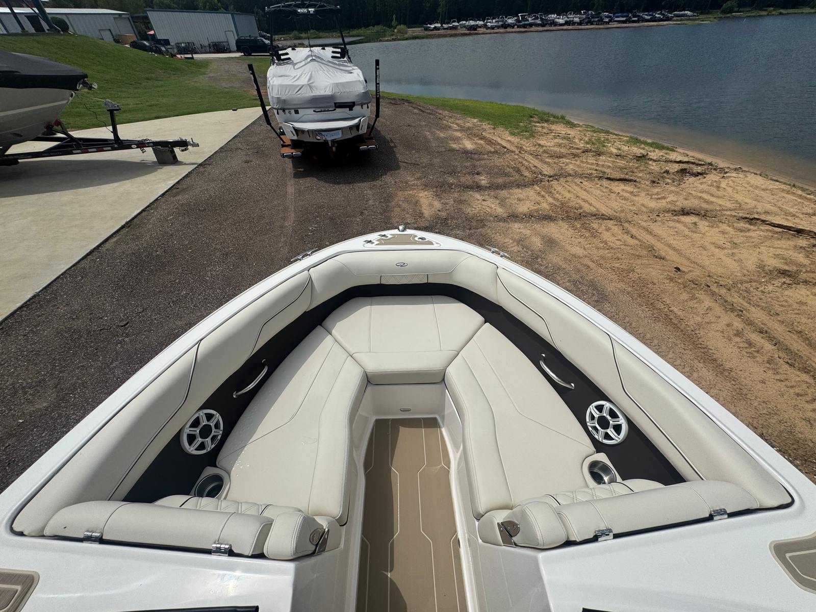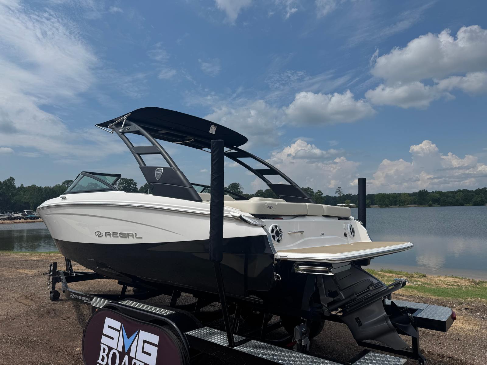 The Regal LS2 Bowrider is packed with special features that elevate your boating experience. The SeaDek cockpit sole and SeaDek swim platform provide a comfortable, non-slip surface, perfect for barefoot relaxation or active water sports. The dual battery switch with tray and cables, along with a battery charger, ensures you have reliable power for all your onboard electronics and accessories. Docking lights make evening arrivals and departures safer and more convenient, while the travel storage cover in black keeps your boat protected when not in use. Every detail, from the stylish River Rock interior to the practical storage solutions, reflects Regal’s dedication to both luxury and functionality.
