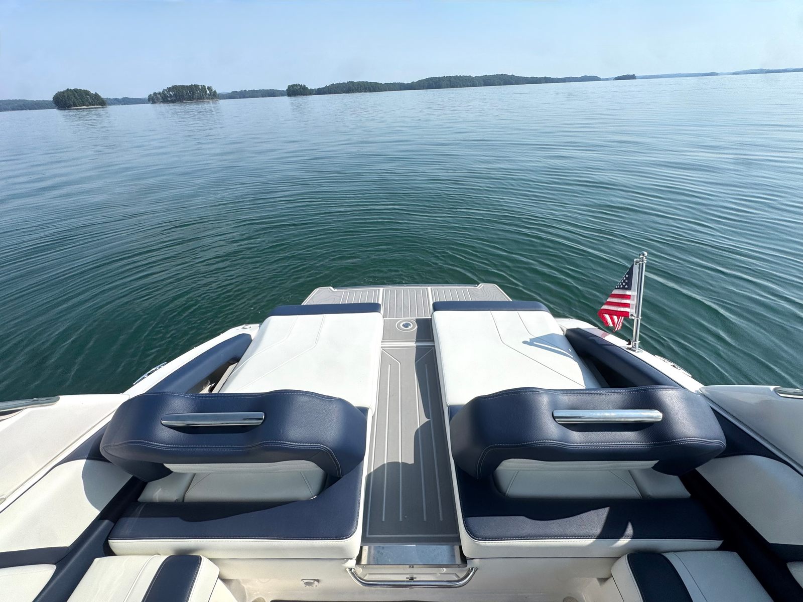 Powered by a Volvo V8 380 EVC2 DP CAT engine, this bowrider produces 380 horsepower with smooth acceleration, responsive handling, and excellent fuel efficiency. Its Mediterranean Blue hull, Tahiti Beach White bottom, and matching bootstripe make a striking impression on the water or at the dock.