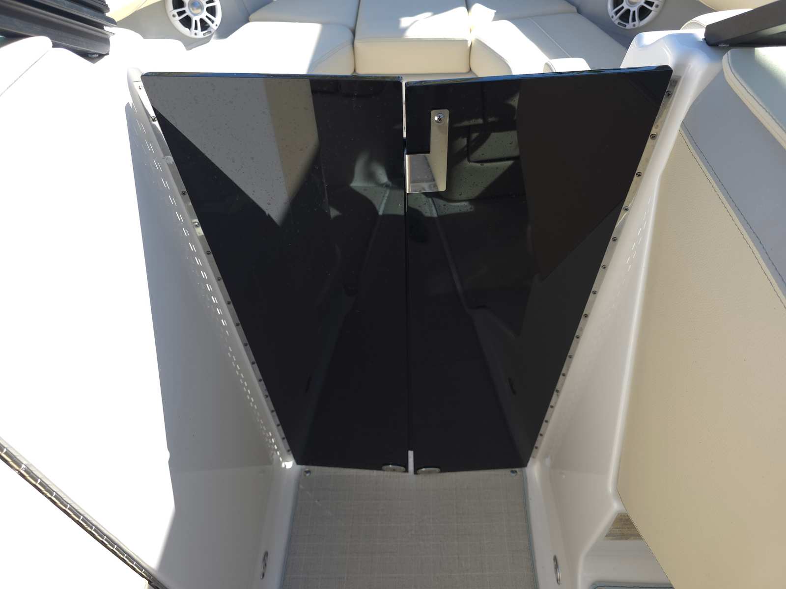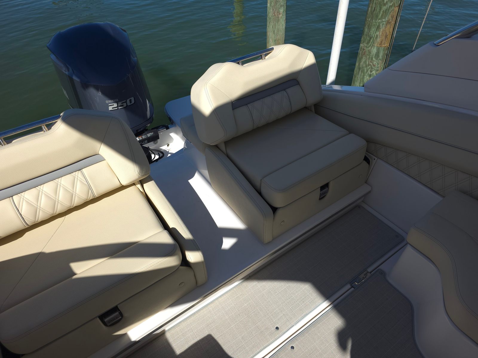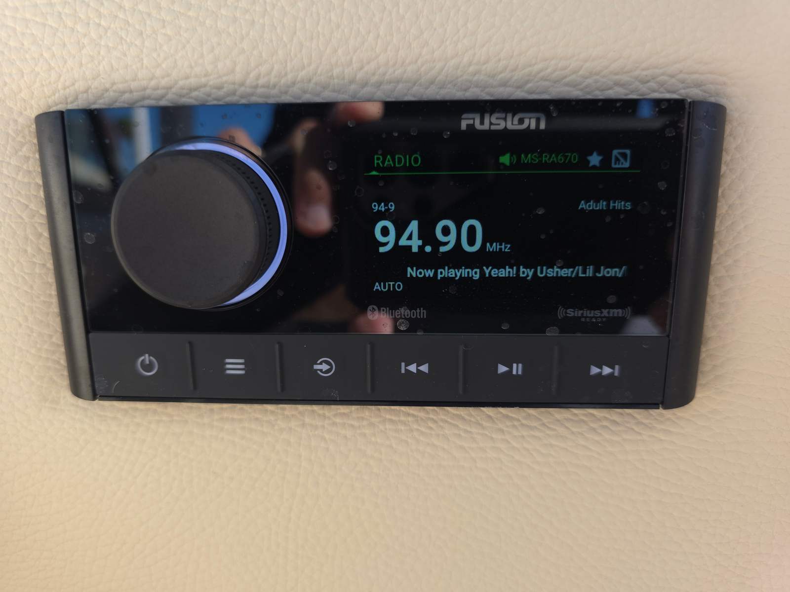 Dual Garmin 12" Displays, Aftermarket Anchor windlass, Bow walkthrough doors, Cockpit table, Cockpit and bow cover, Bow shade, Bow thruster, Trim tabs, Fusion stereo system, Full head porcelain, Stainless sink, Retractable aft seat, Power Hard Top retractable.