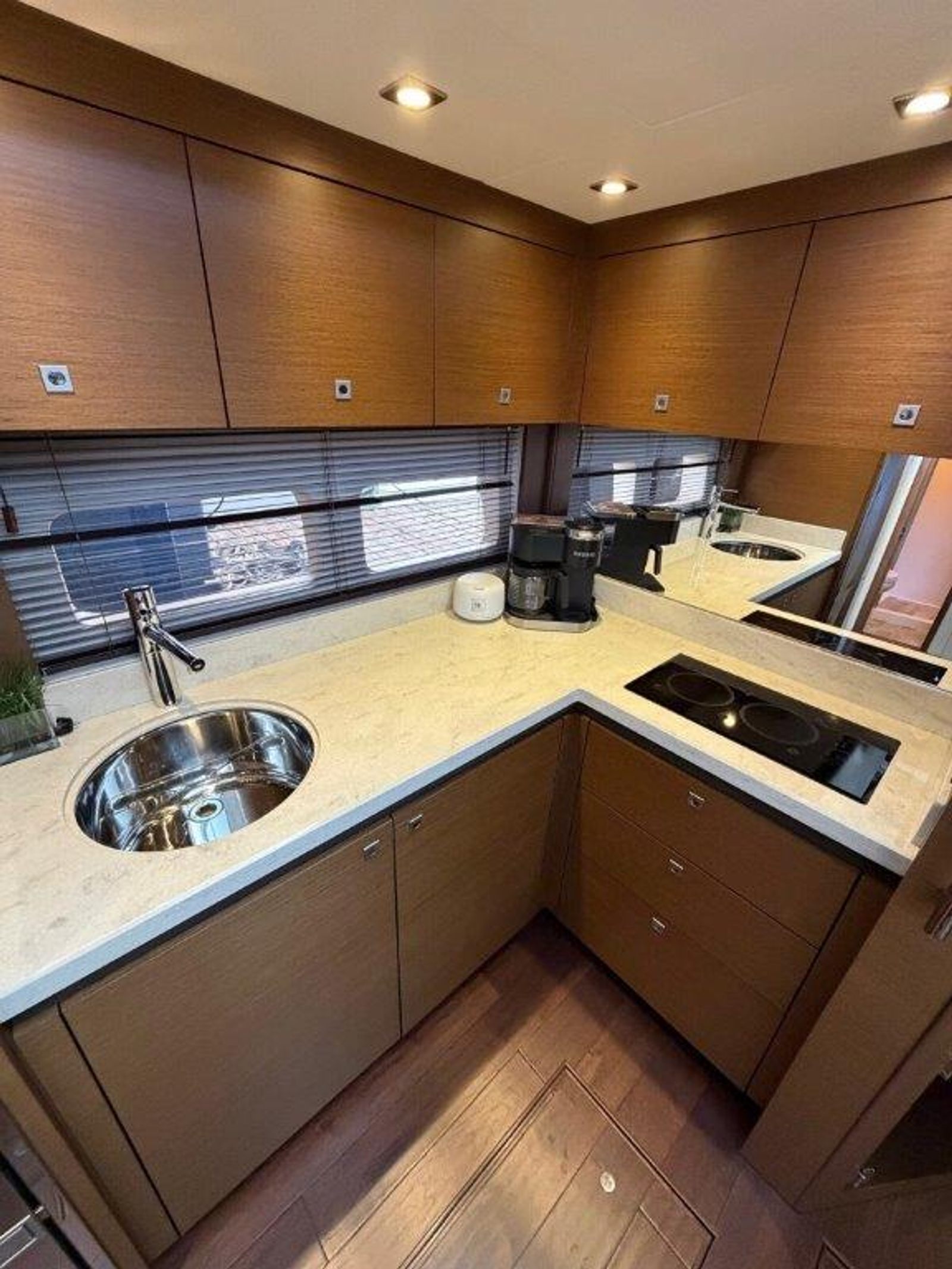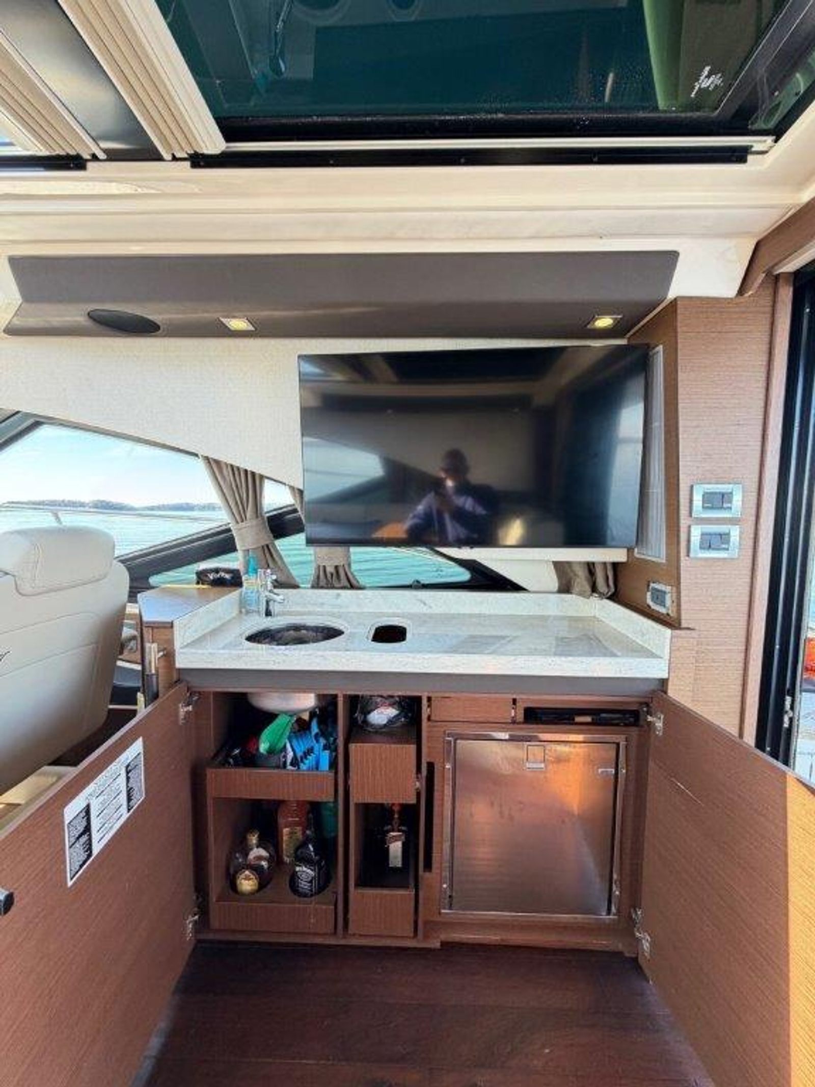 Below deck, the midship master suite is an oasis of comfort, featuring upgraded fabrics and finishes along with separate head and shower compartments. The main cabin boasts a gourmet galley and plush seating in a naturally lit, atrium-style space, making it ideal for gatherings or quiet relaxation.