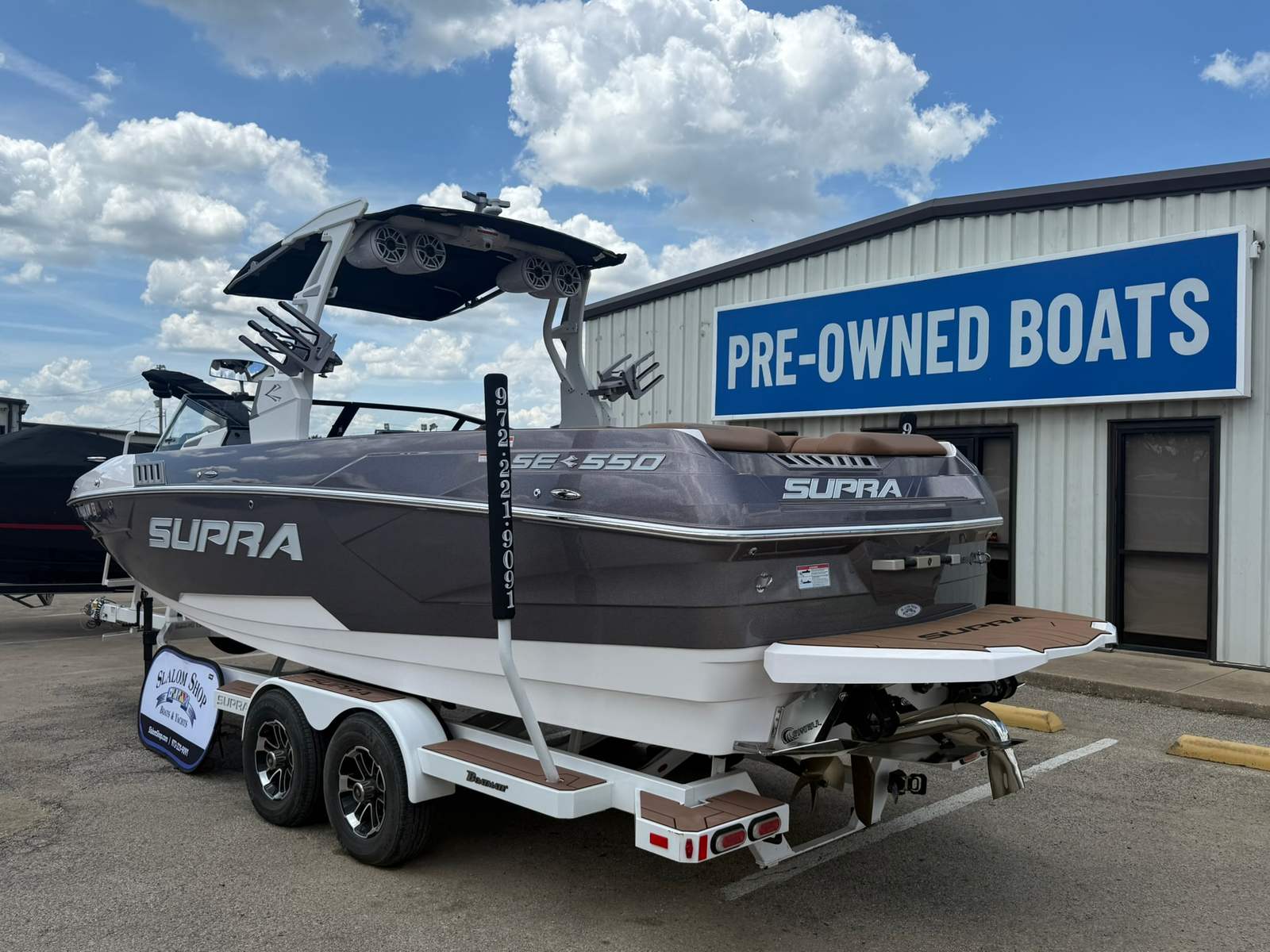 Now available on consignment at our New Used Boat Super Center in Lewisville, Turn heads and dominate the water with this 2022 Supra SE 550, finished in stunning Gunmetal Flake & White Gelcoat. This top-of-the-line wake and surf machine is powered by a Supercharged Indmar 6.2L Raptor V8 (550 HP) and shows just 148 hours of run time. With every premium feature Supra has to offer—including dual stern thrusters, SWELL Surf System, and AutoWake—this boat is built to deliver next-level performance and luxury.